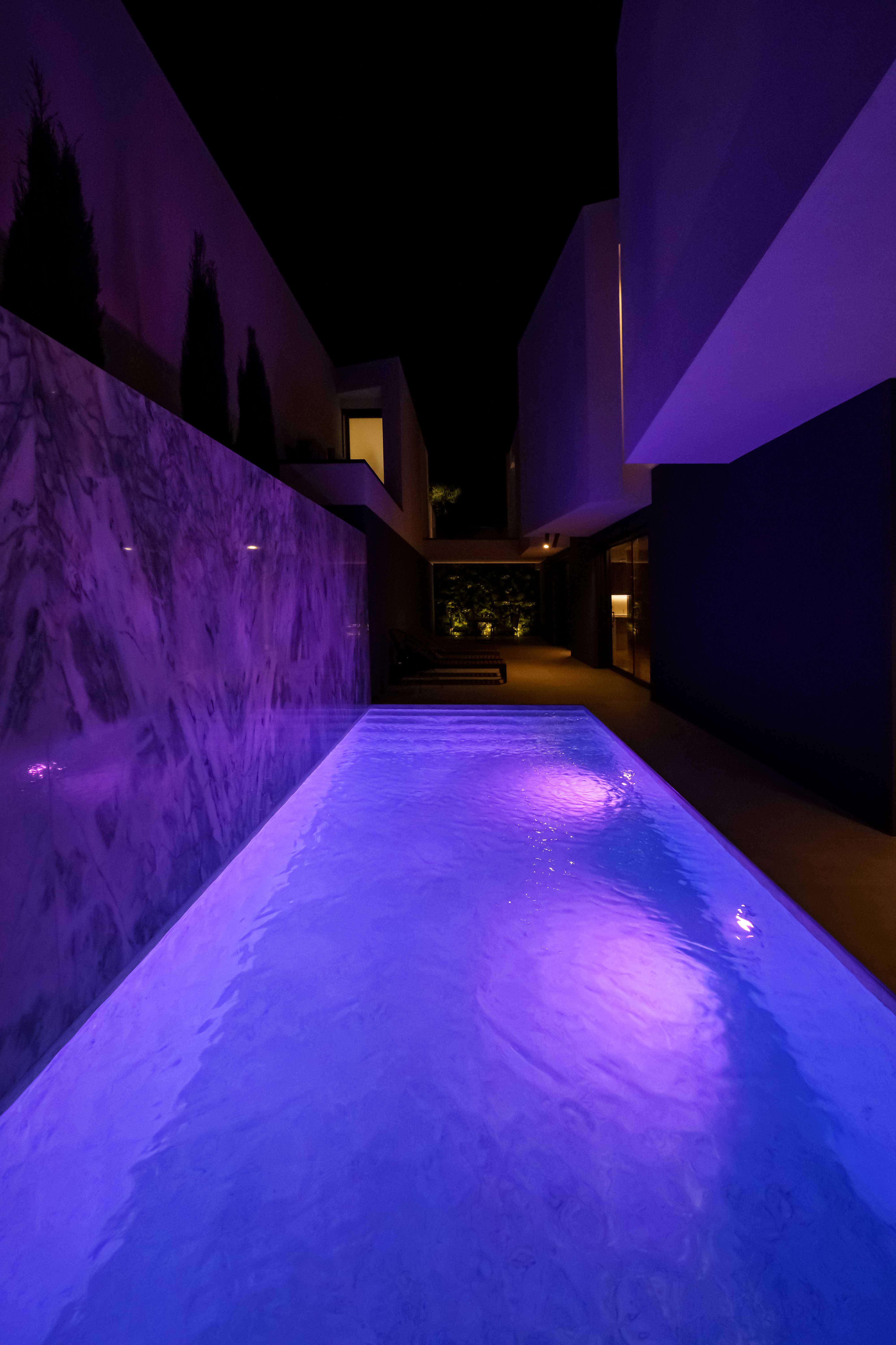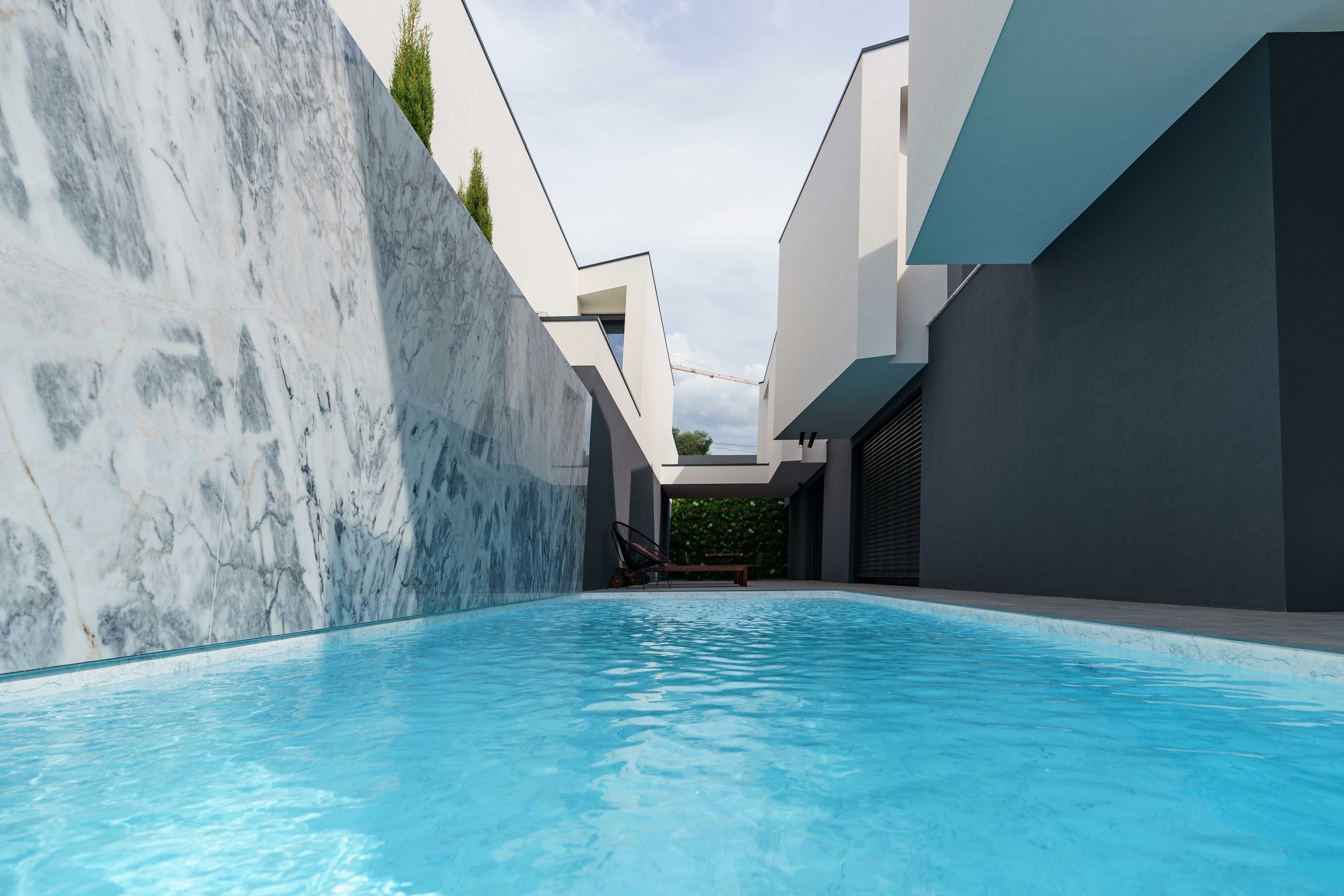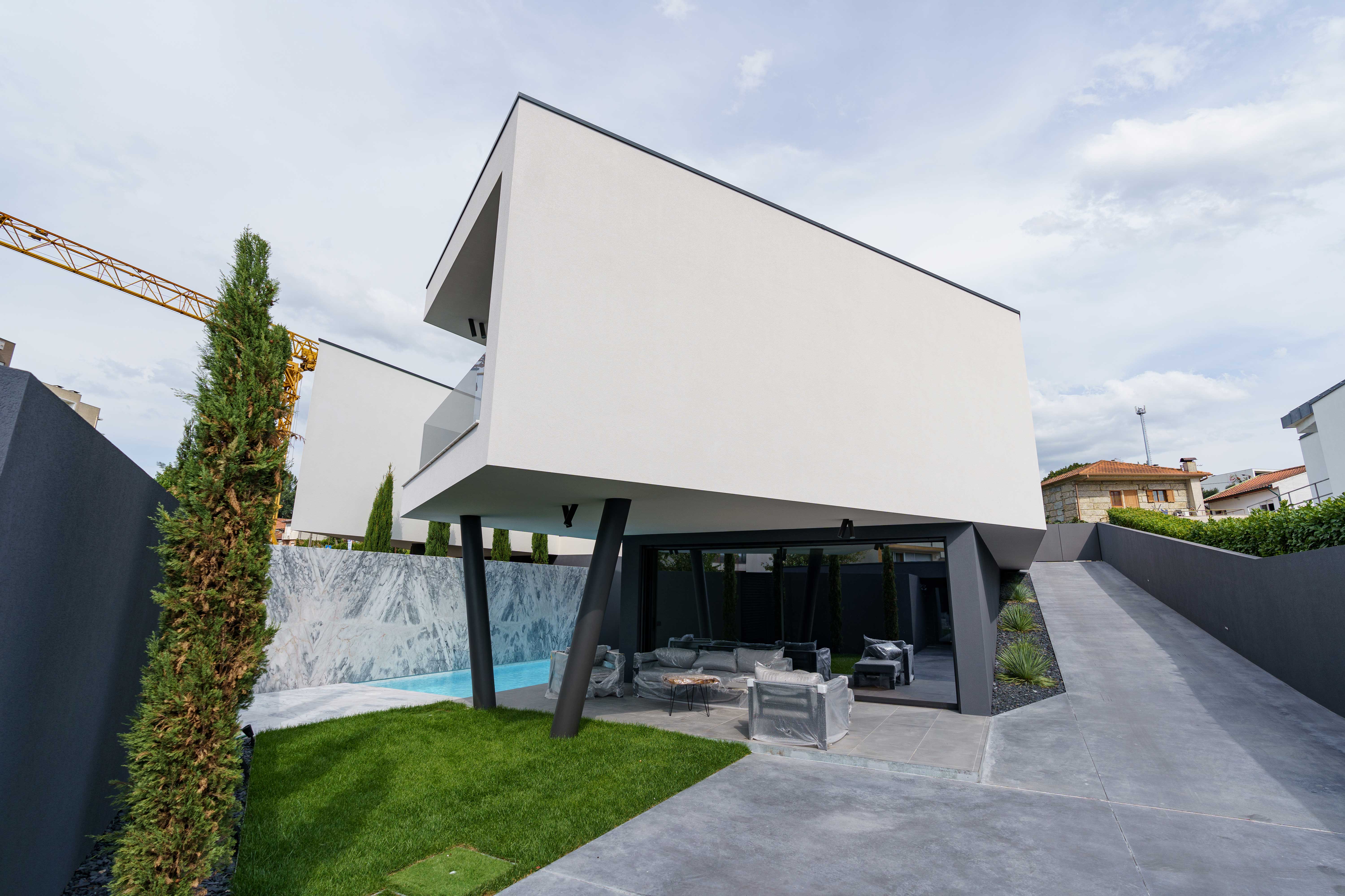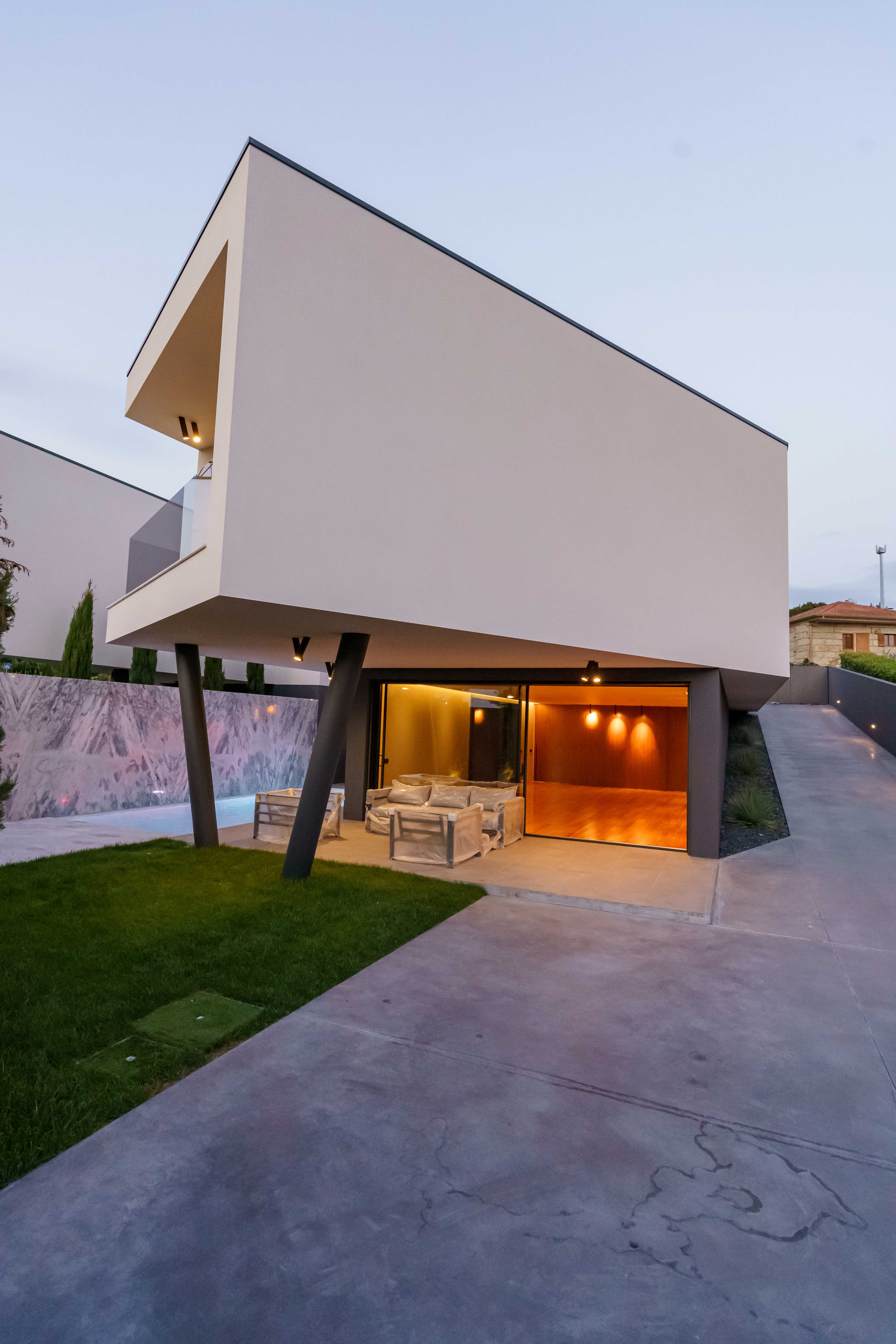 O projeto visa a construção de uma moradia bifamiliar constituída por duas unidades de cave+r/c tipo T3. Propomos os edifícios assentes na cota mais baixa do terreno, ficando o r/c sensivelmente à cota da rua. Os programas e as distribuições funcionais apresentam-se agrupados por usos e de caráter introvertido. Em busca da melhor solução e como resposta a esta introversão e privacidade, a moradia fecha-se praticamente a Nascente, “virando as costas” à rua e Poente, abrindo-se doseadamente para os outros quadrante, com o propósito de garantir privacidade com a vizinhança, bem como entre unidades. A implantação resulta da geometria do lote, da legislação, dos afastamentos e alinhamentos com a envolvente, bem como da procura de um certo anonimato. Pretendesse uma integração na paisagem o mais anónima possível, pelo que se optou por construir um único piso acima da cota da rua de acesso, implantado sensivelmente à cota desta. Esta opção e face à topografia do terreno obriga a que o edifício fique semi-enterrado no piso inferior a Nascente. A imagem apresenta-se como uma sobreposição de volumes constituídos pelos pisos, aos quais associamos funções, serviços, lazer e descanso.