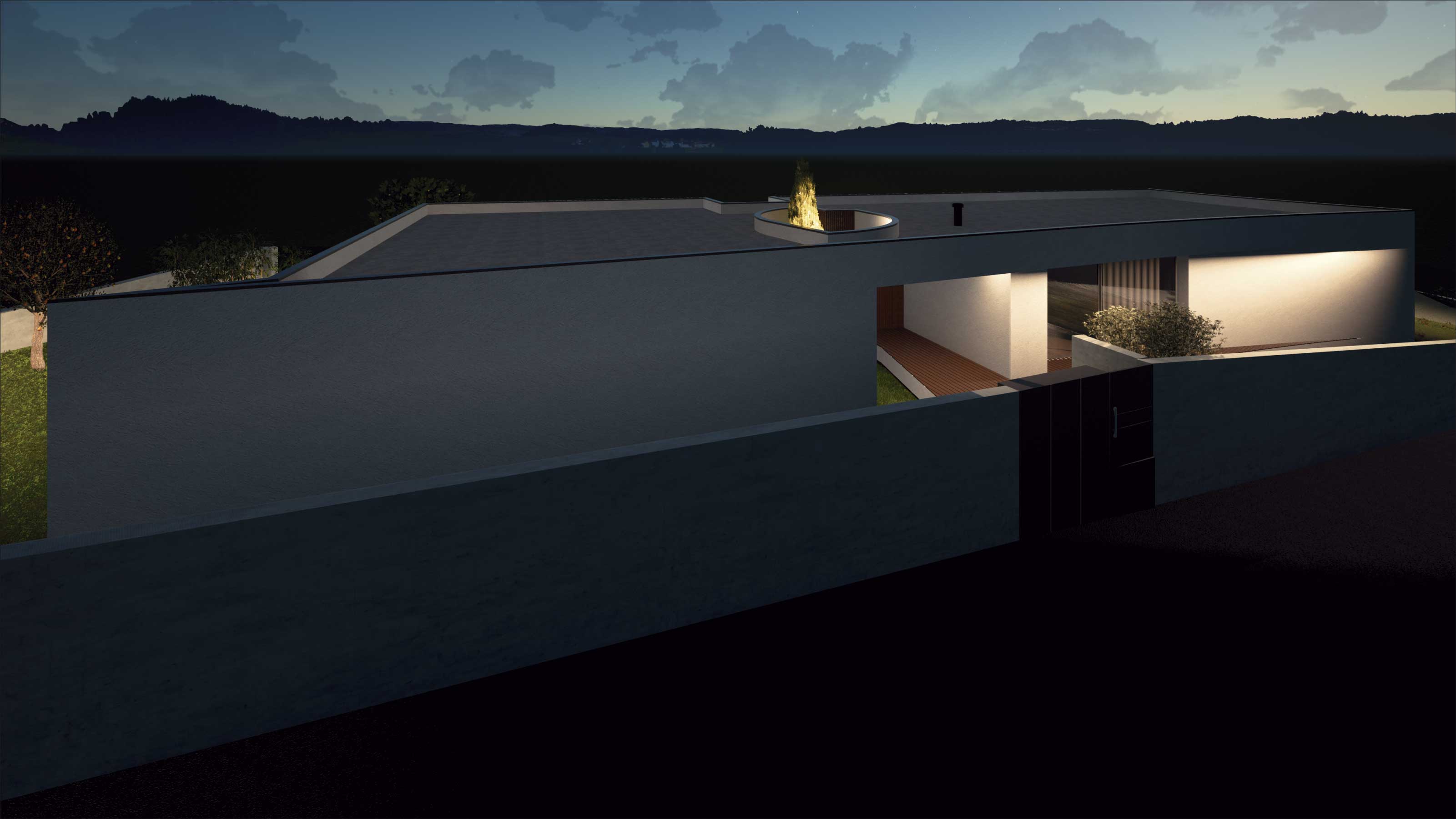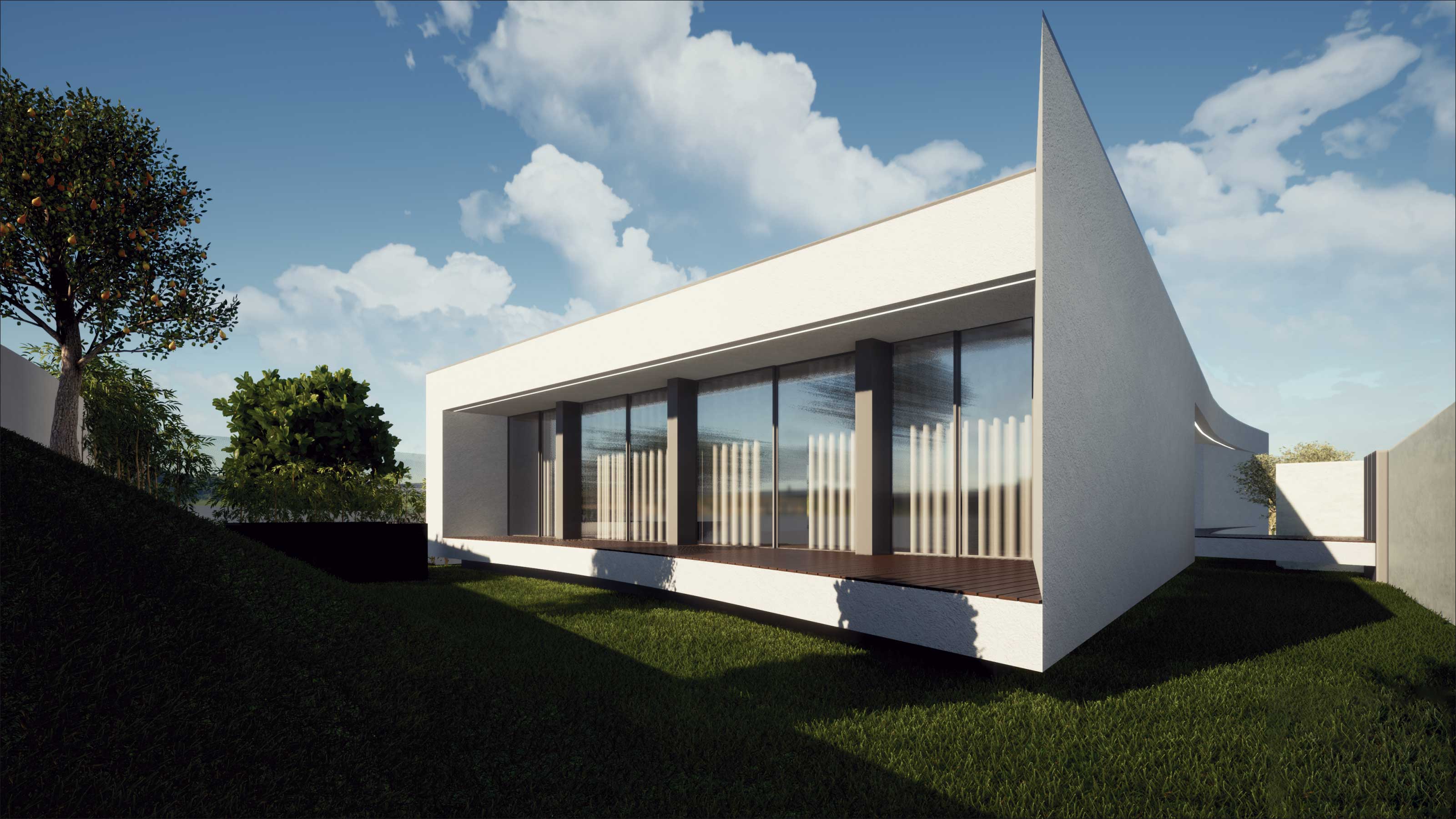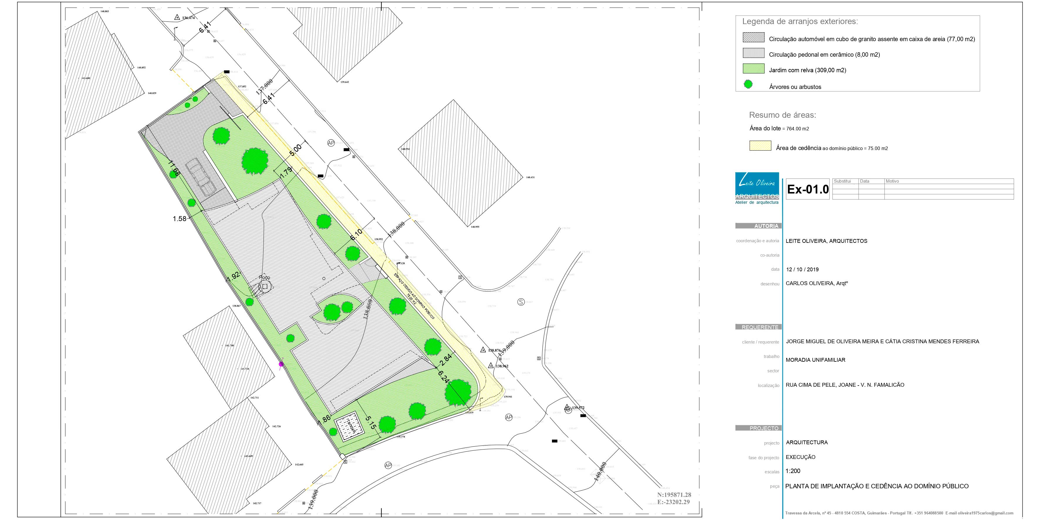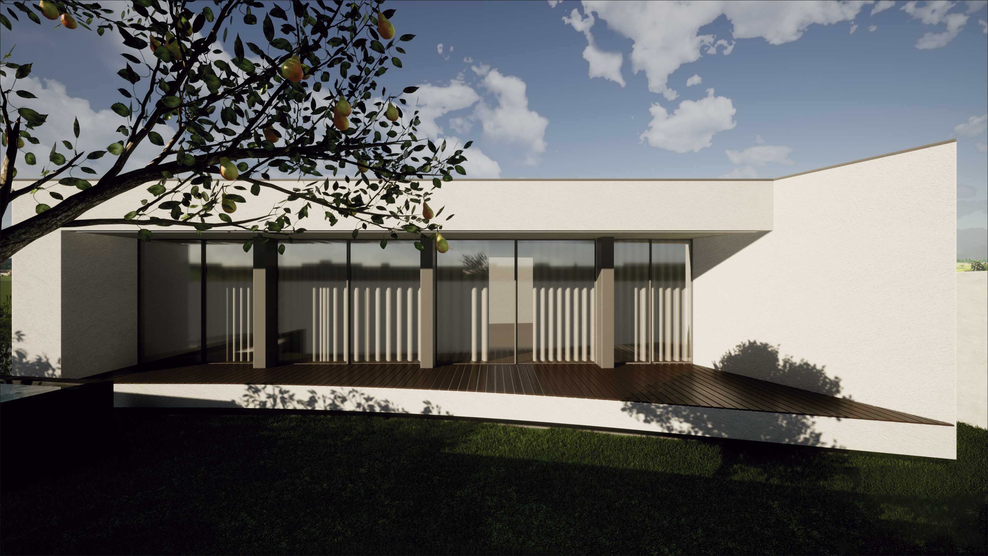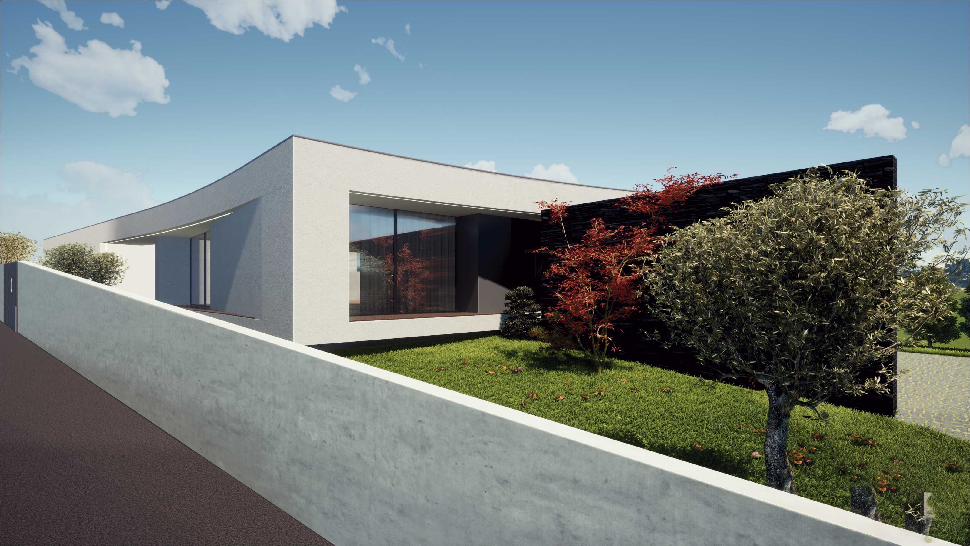 O projecto visa a construção de uma moradia unifamiliar de r/c tipo T3. A implantação resulta da geometria do lote, da legislação, dos afastamentos e alinhamentos com a envolvente, bem como da procura de um certo anonimato. Propomos um edifício que se estenda pelo terreno, de implantação “rectangular” onde pontualmente são criados motivos que rompem a implantação/construção, que após o nivelamento do terreno assenta a uma cota média cerca de 0,30 m abaixo da rua, ficando a entrada pedonal sensivelmente de nível com a mesma. Por motivos de funcionalidade, privacidade e térmico, a moradia fecha-se praticamente a Norte, abrindo-se mais acentuadamente para os outros quadrantes.