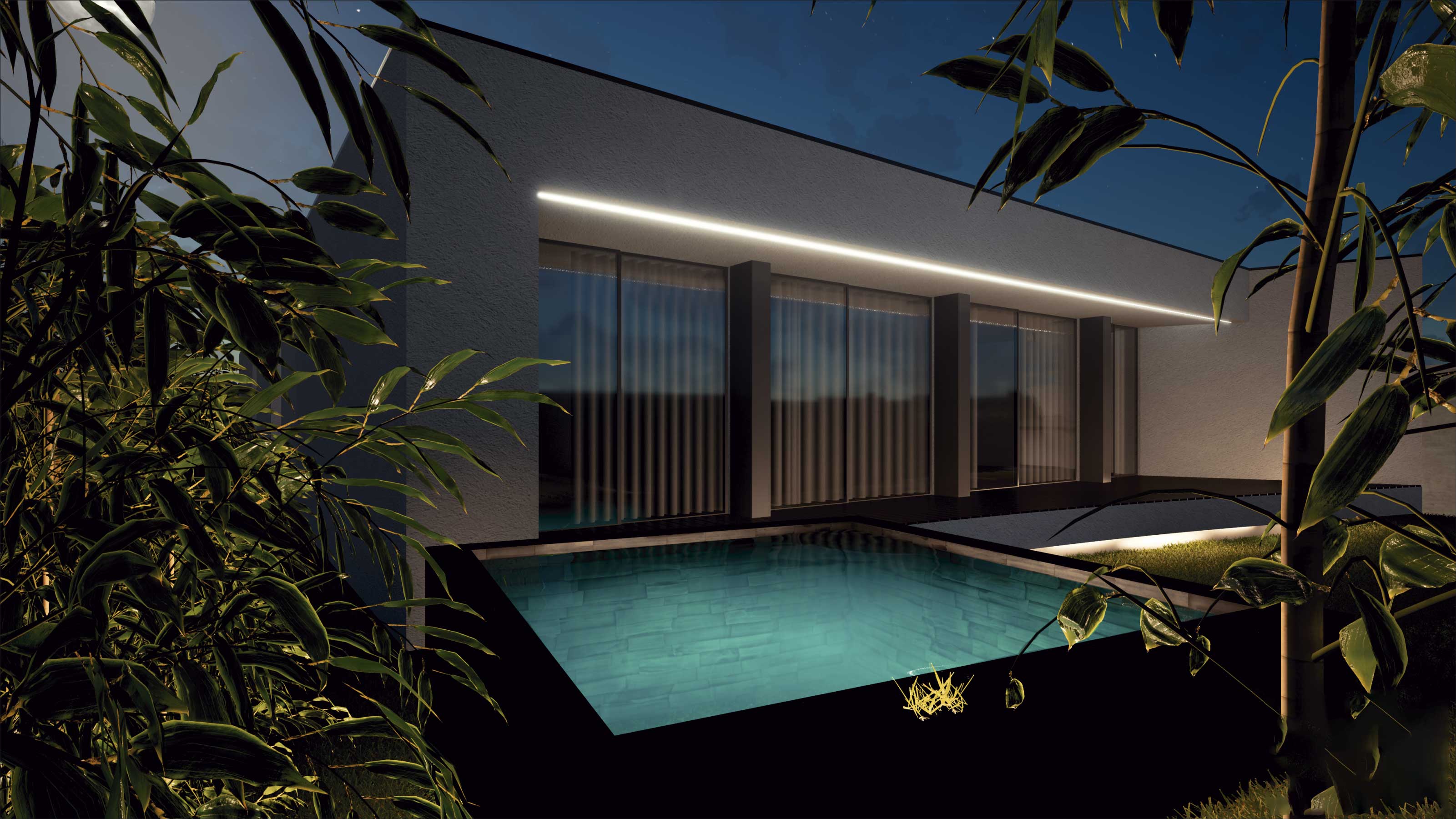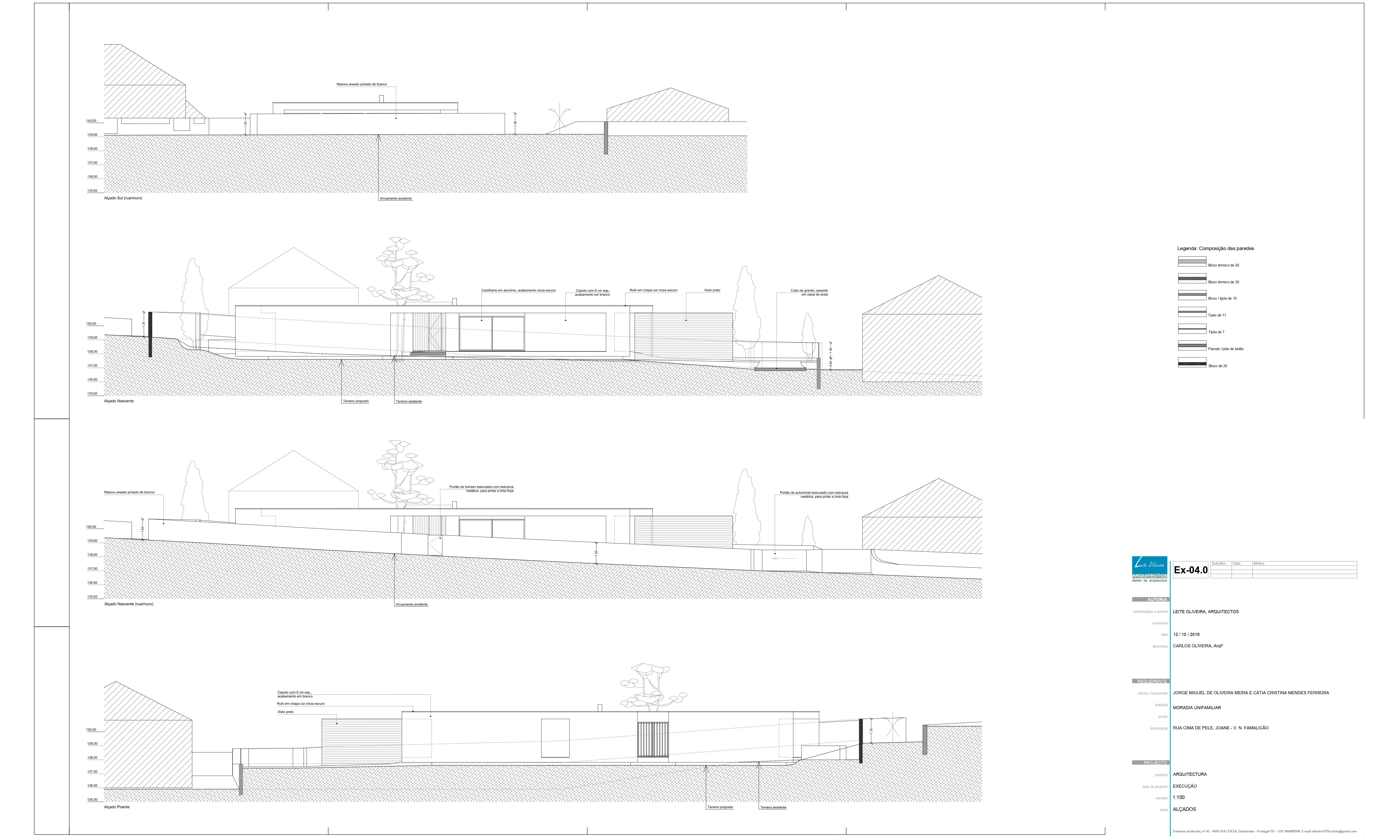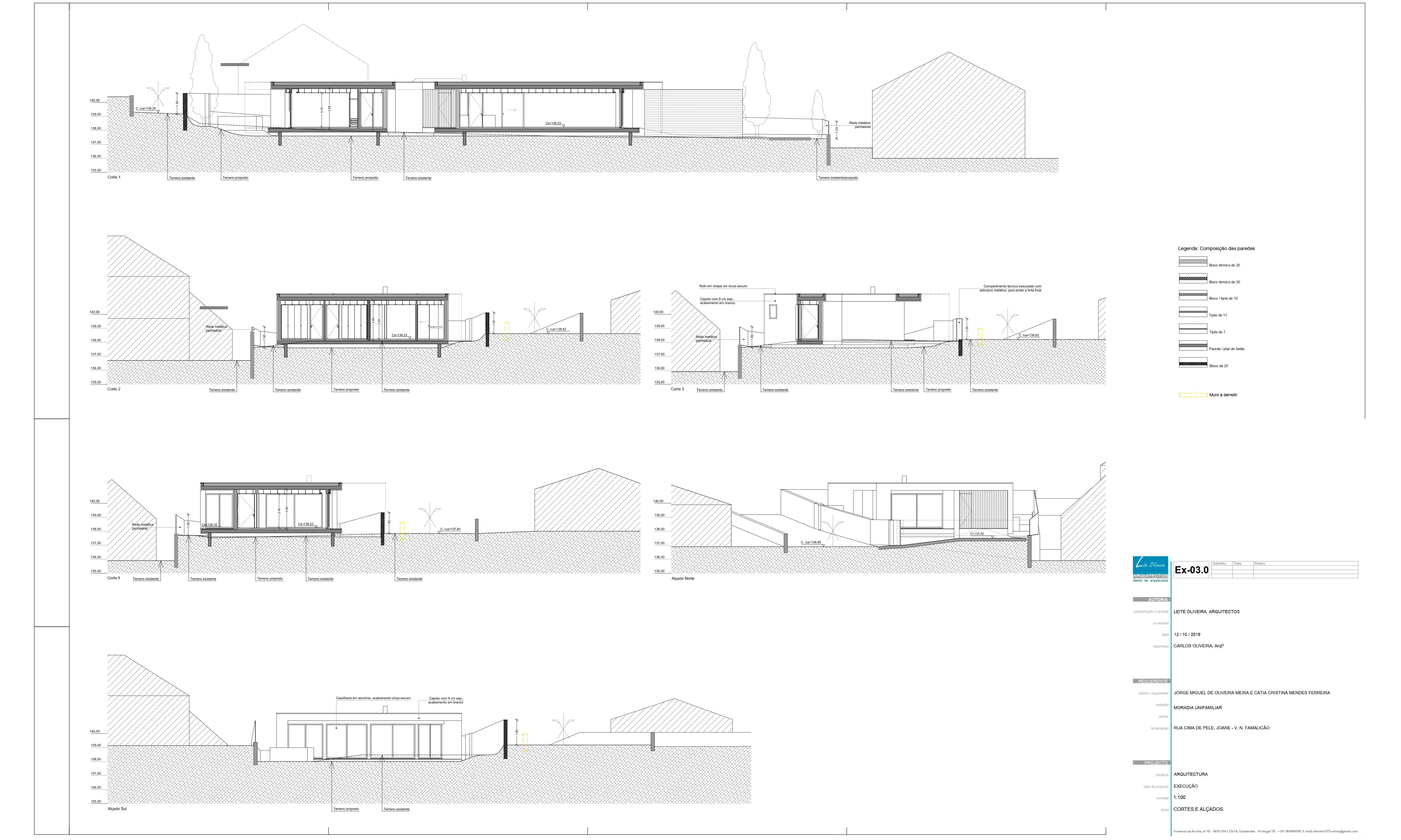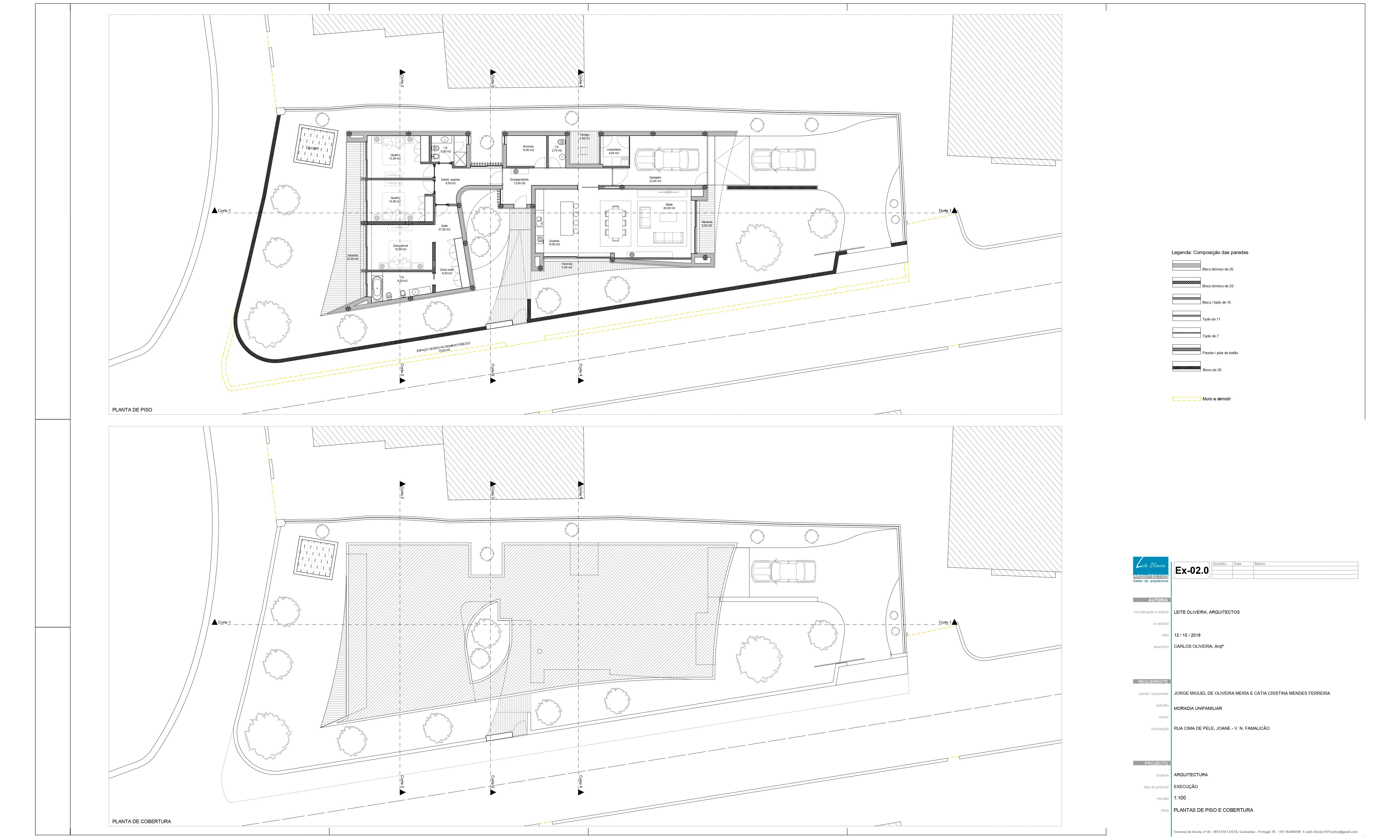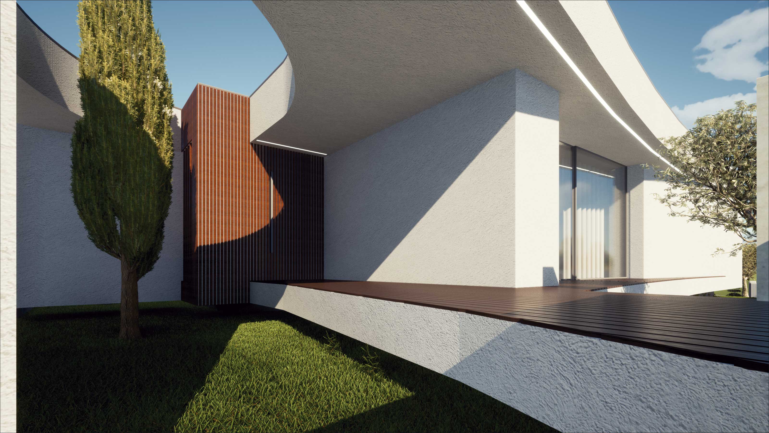 O projecto visa a construção de uma moradia unifamiliar de r/c tipo T3. A implantação resulta da geometria do lote, da legislação, dos afastamentos e alinhamentos com a envolvente, bem como da procura de um certo anonimato. Propomos um edifício que se estenda pelo terreno, de implantação “rectangular” onde pontualmente são criados motivos que rompem a implantação/construção, que após o nivelamento do terreno assenta a uma cota média cerca de 0,30 m abaixo da rua, ficando a entrada pedonal sensivelmente de nível com a mesma. Por motivos de funcionalidade, privacidade e térmico, a moradia fecha-se praticamente a Norte, abrindo-se mais acentuadamente para os outros quadrantes.