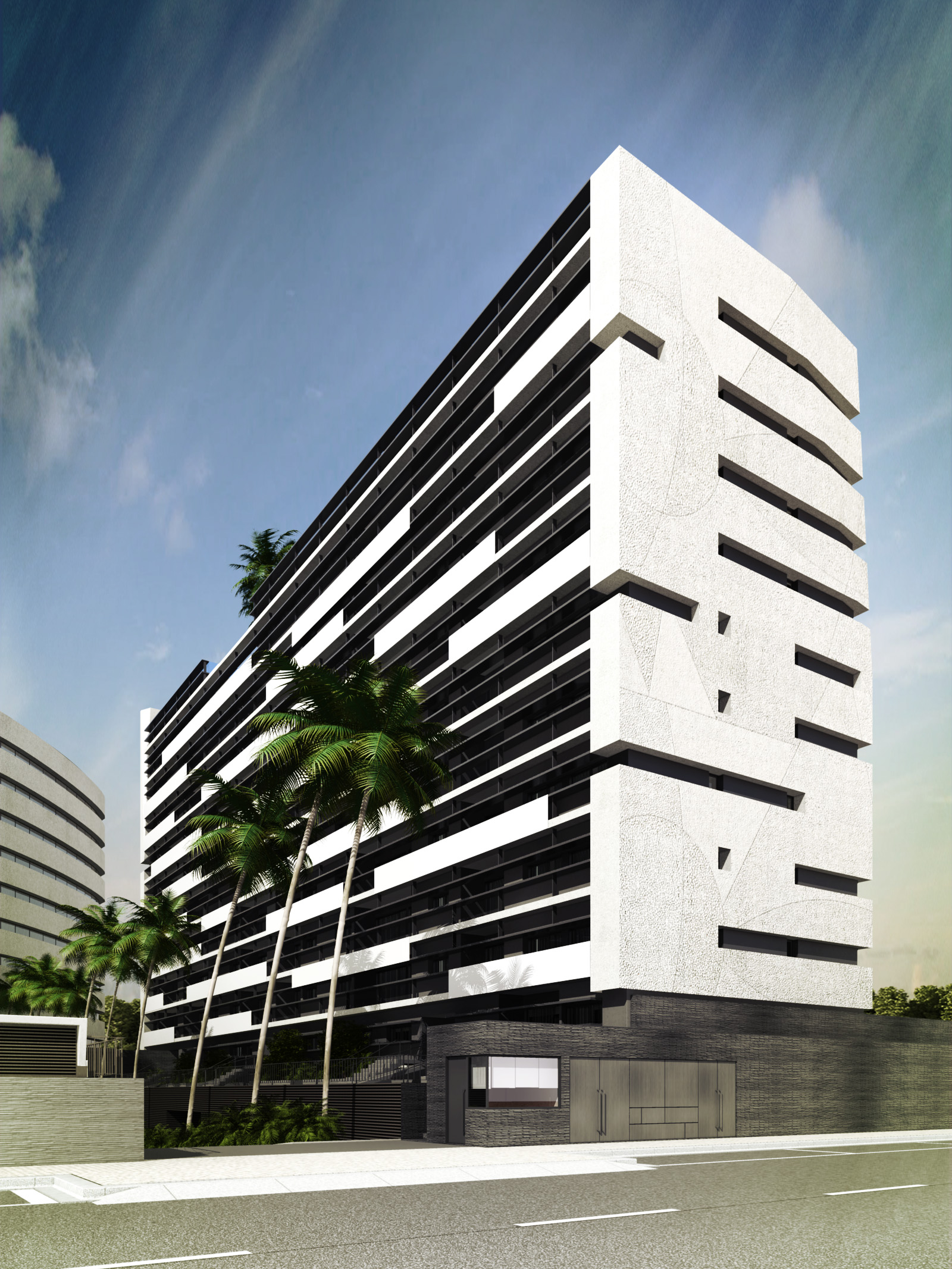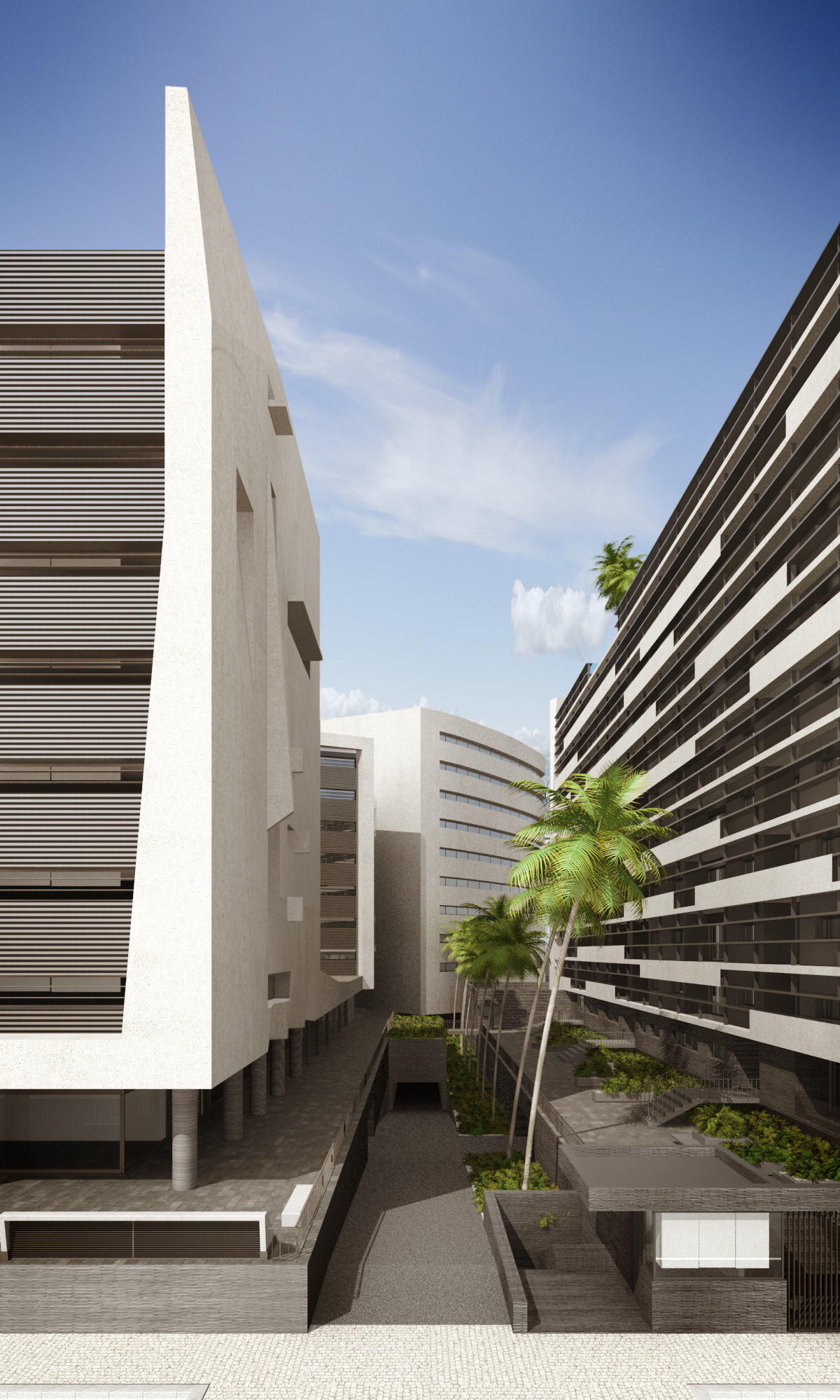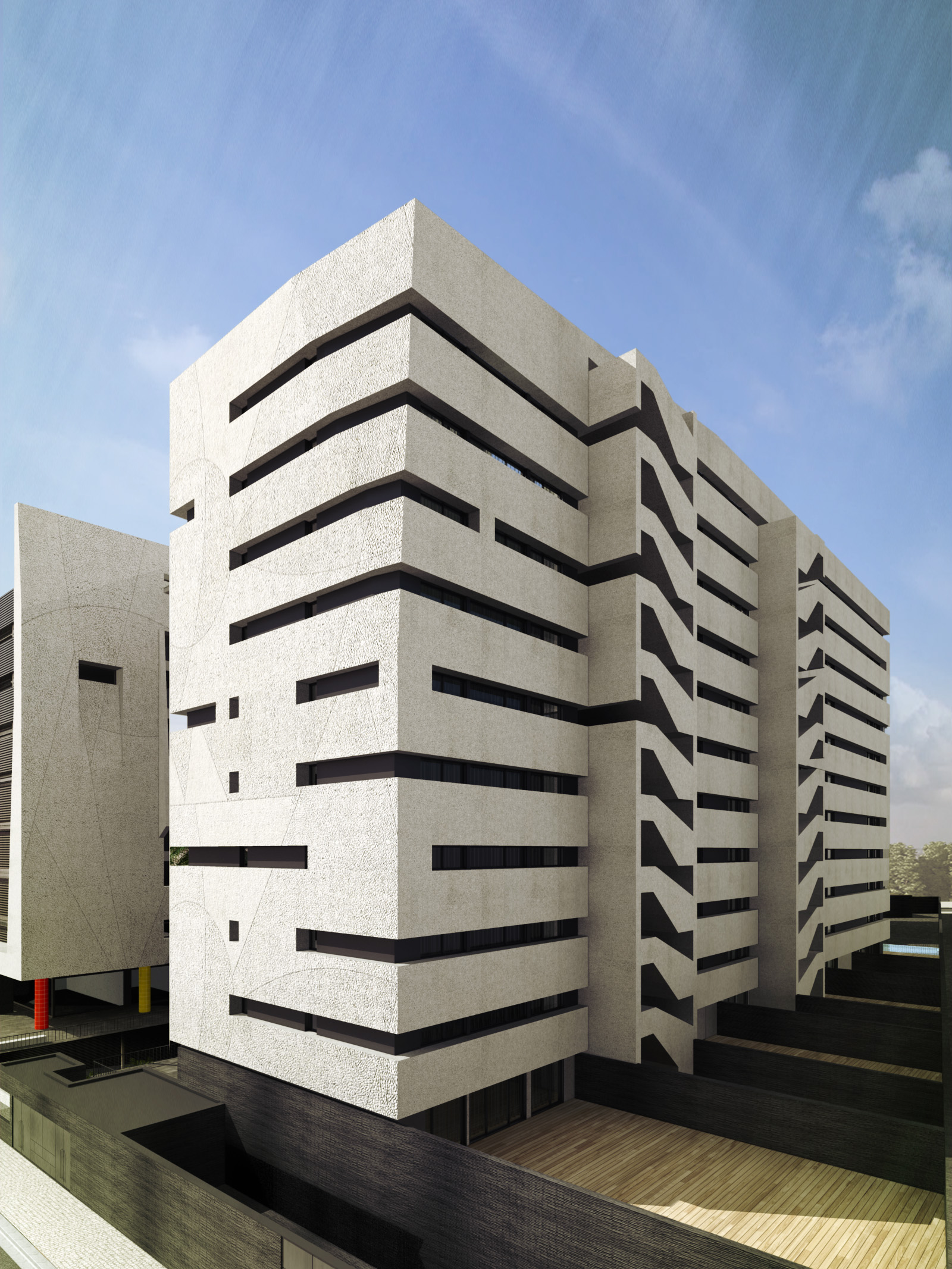 Edifício da Fase 2, inserido num Empreendimento dividido em três fases e que engloba três unidades programáticas: Escritórios, Comércio e Habitação que se completam entre si.Partindo de uma implantação inserida no empreendimento previamente estabelecida e da relação com o conjunto, foi desenvolvido um edifício de habitação que se apresenta como um monólito pousado sobre o embasamento, as caves para estacionamento.