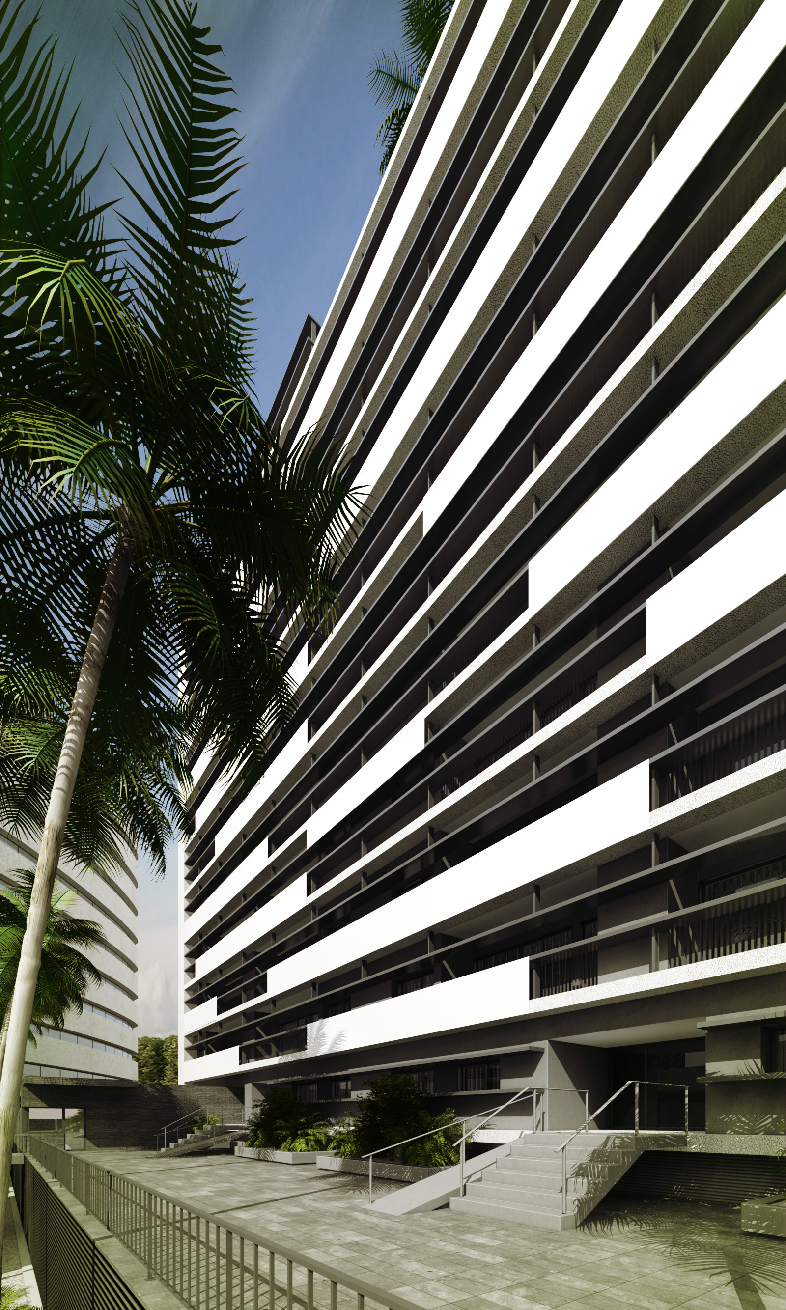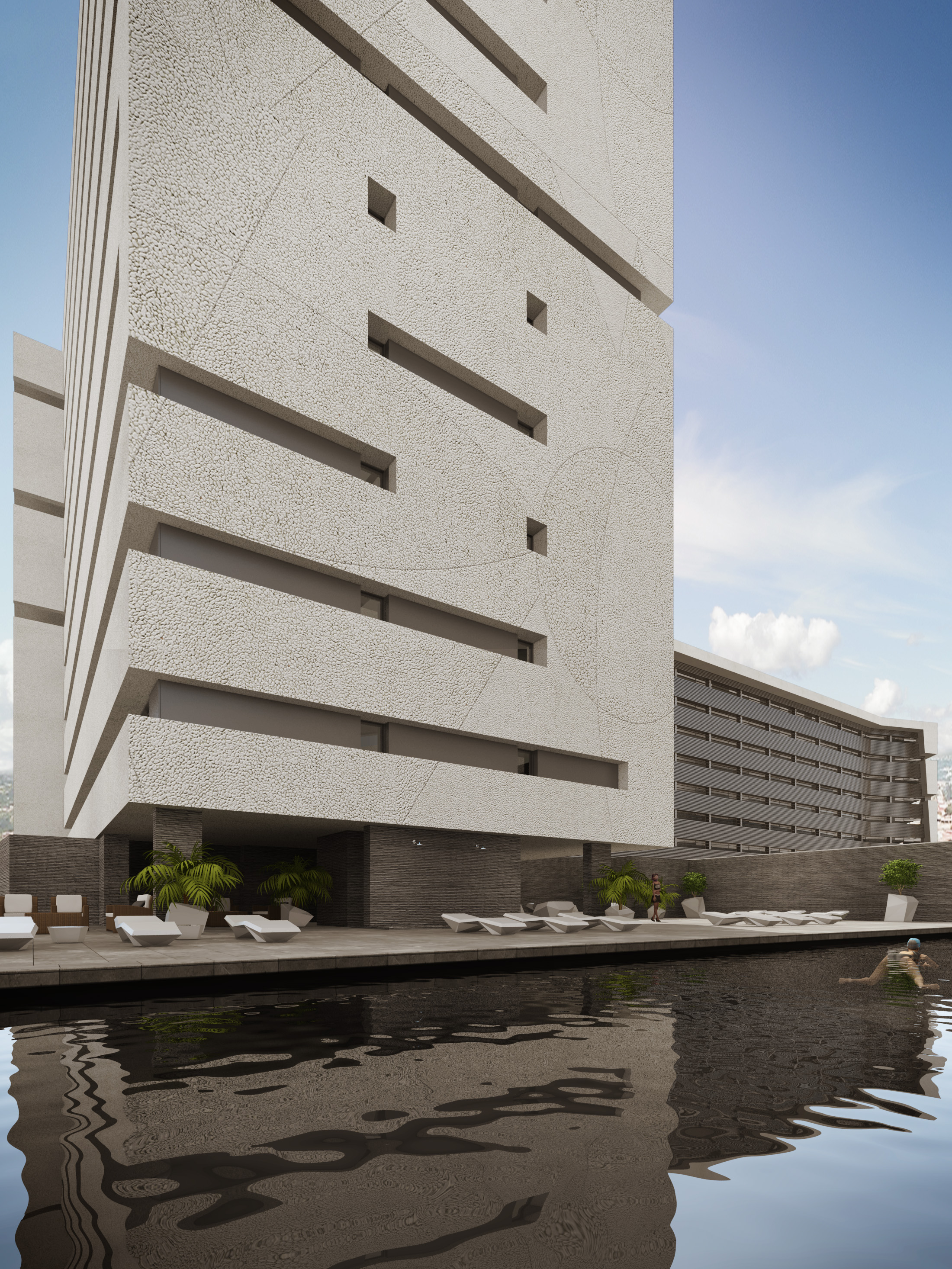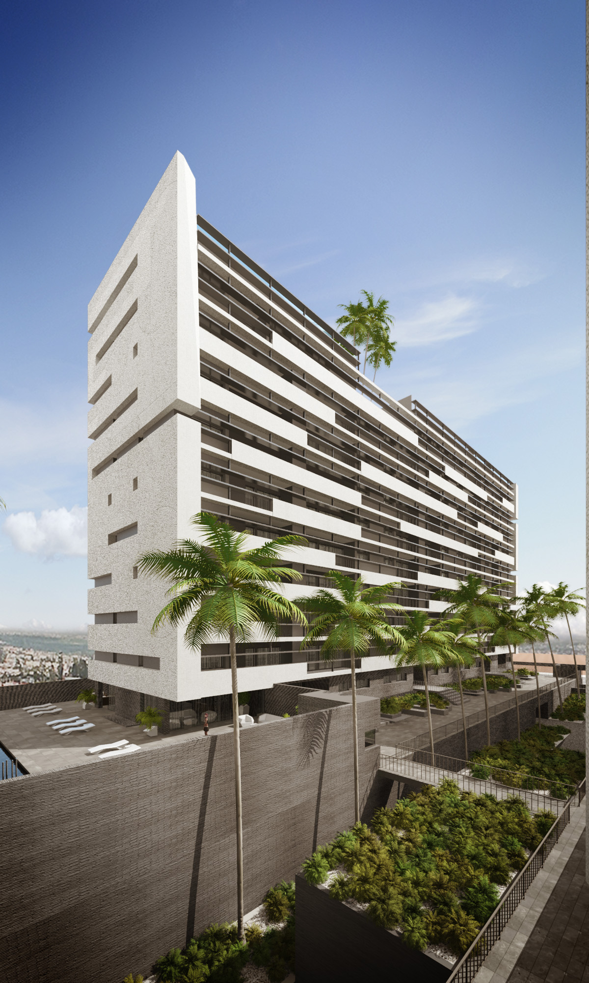 Edifício da Fase 2, inserido num Empreendimento dividido em três fases e que engloba três unidades programáticas: Escritórios, Comércio e Habitação que se completam entre si.Partindo de uma implantação inserida no empreendimento previamente estabelecida e da relação com o conjunto, foi desenvolvido um edifício de habitação que se apresenta como um monólito pousado sobre o embasamento, as caves para estacionamento.