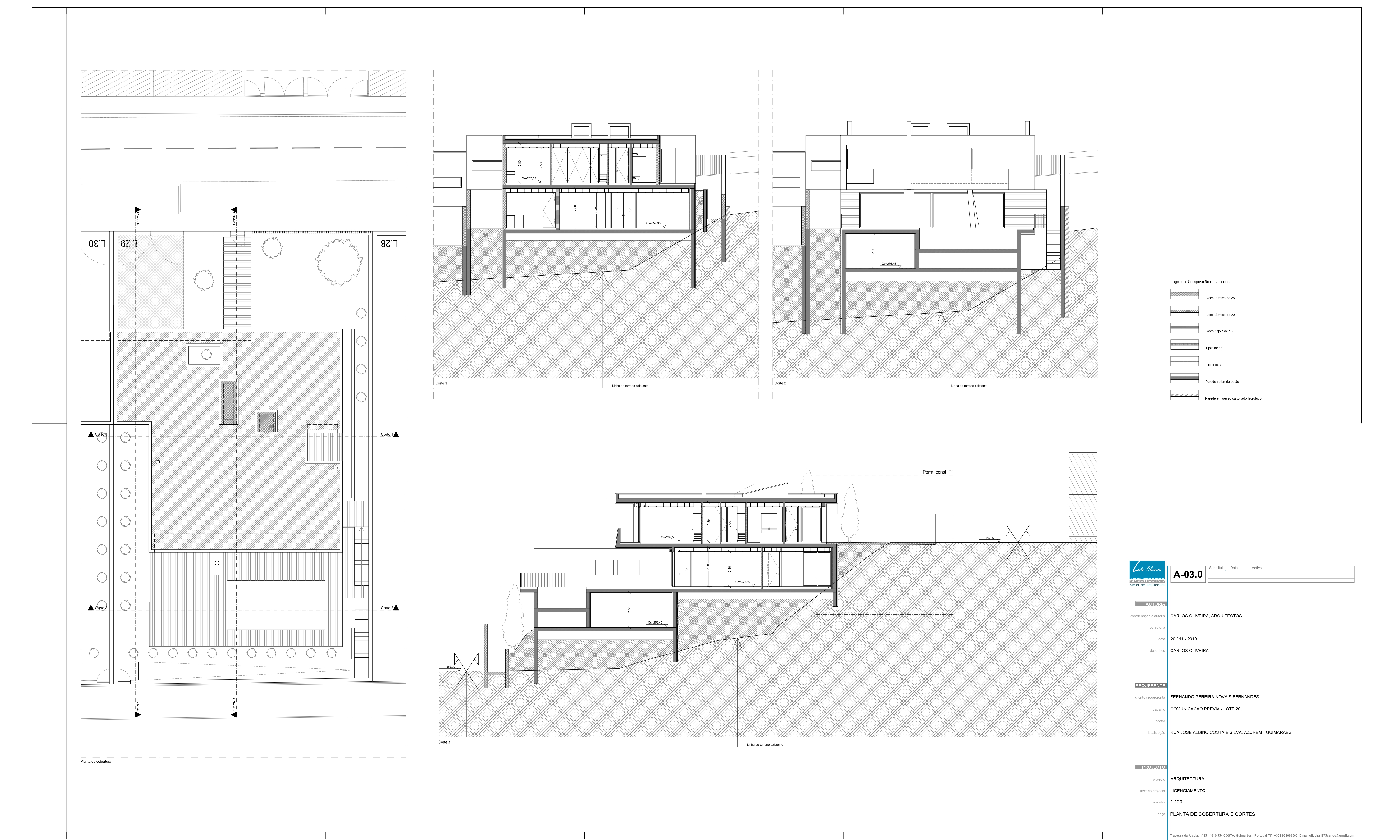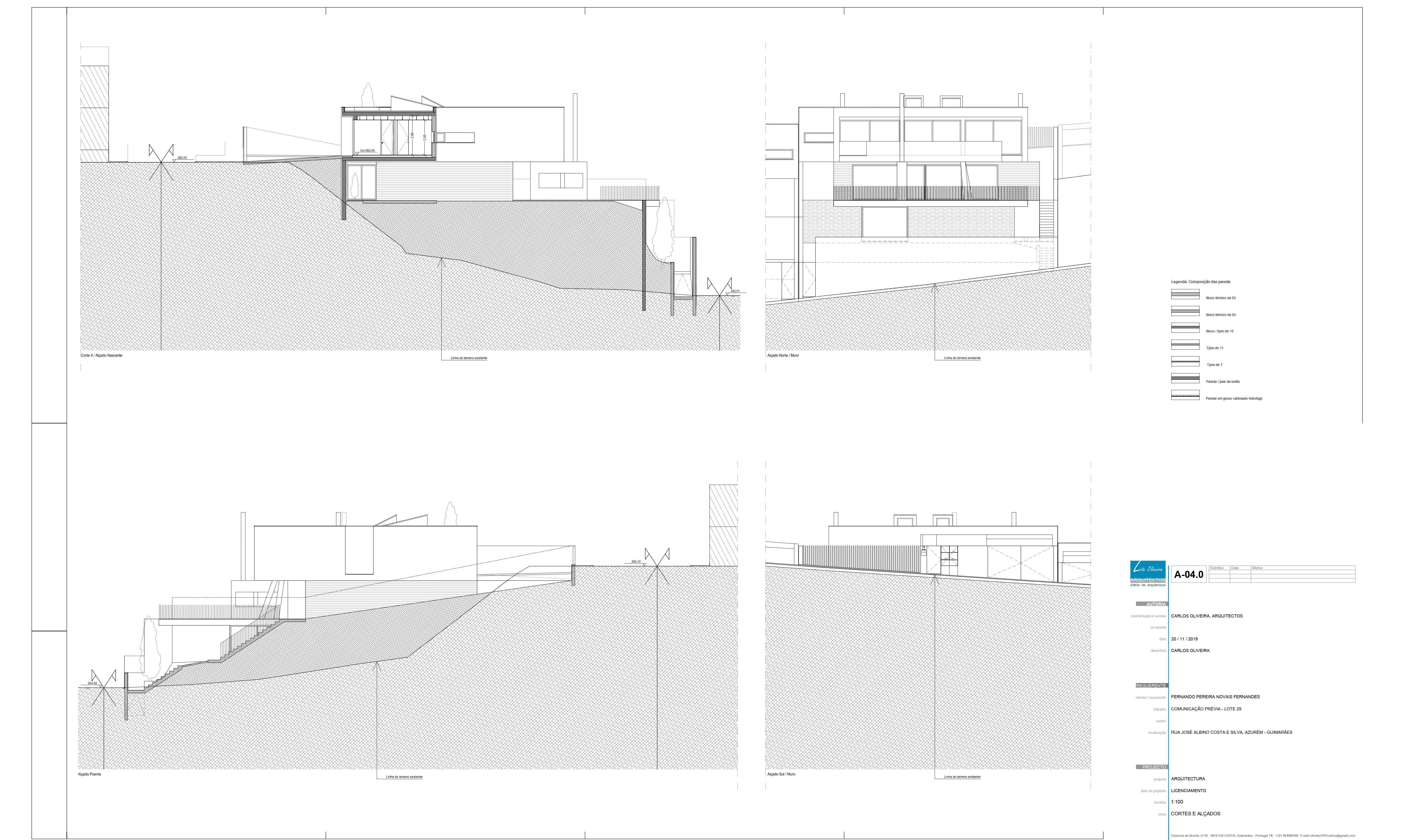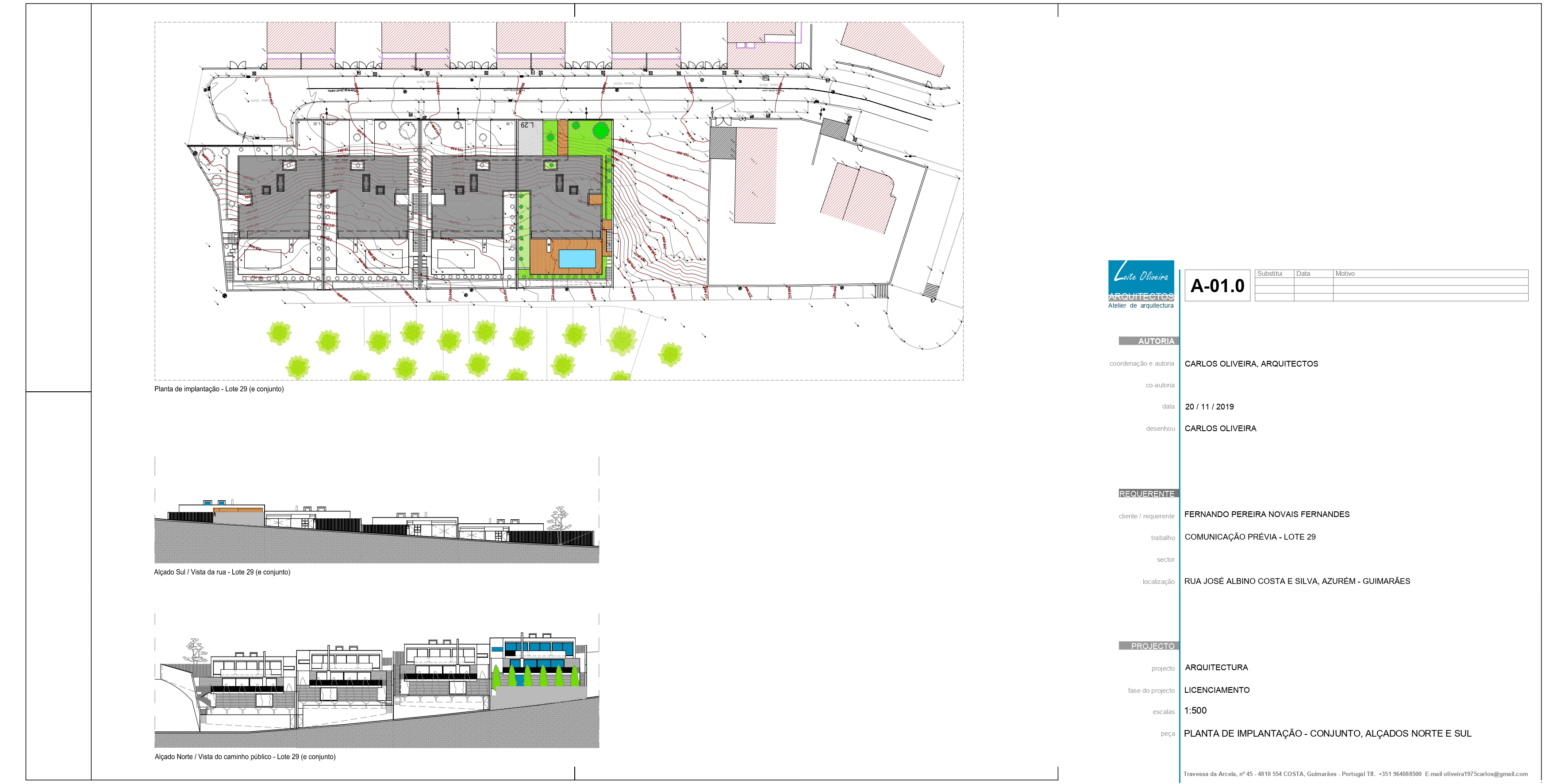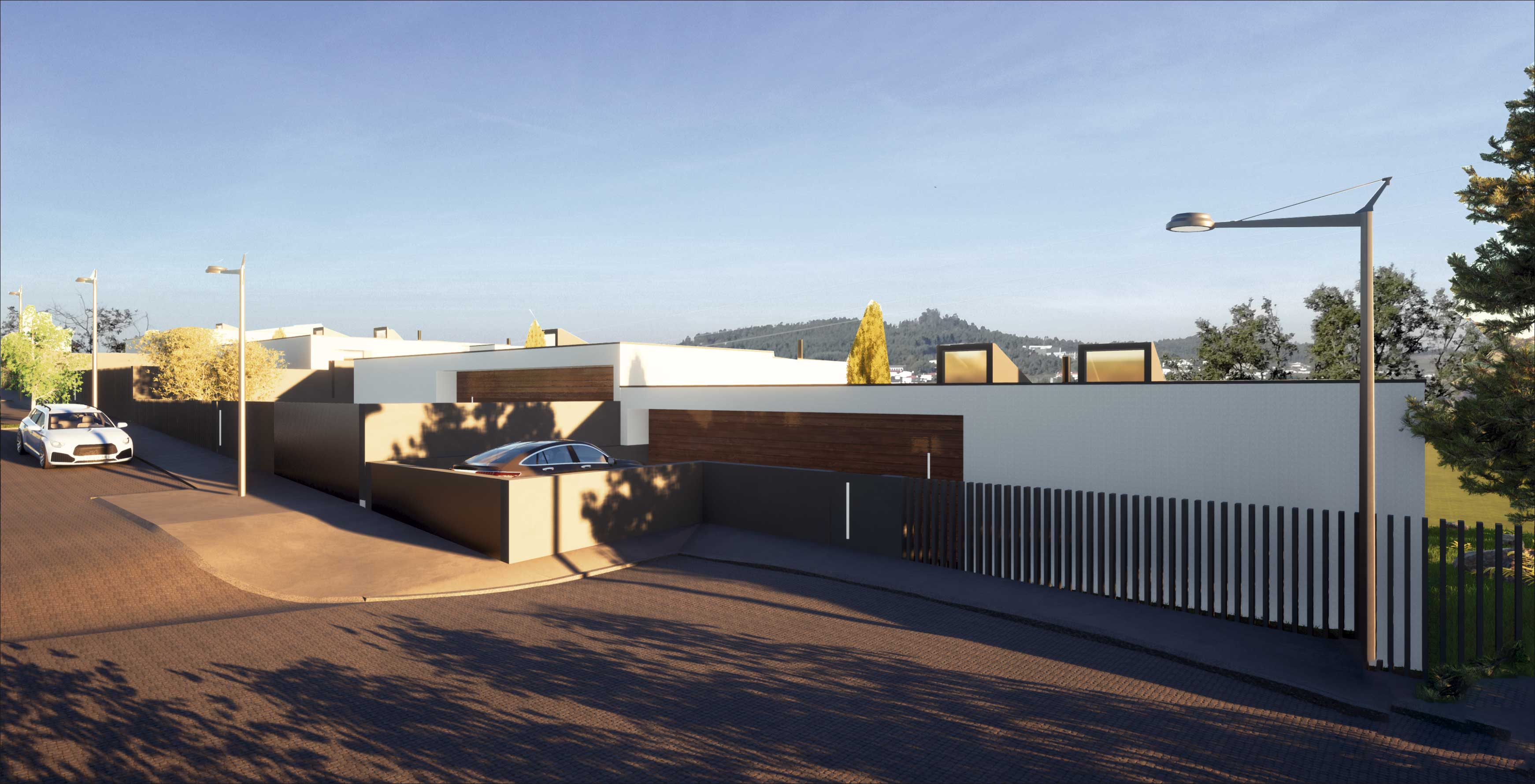 O Loteamento é constituído por quatro moradias de tipologia T3+1 e piscina, constituídas por dois níveis, sendo estes dedicados a usos distintos, diurno e nocturno. O projecto tem como base um terreno com bastante pendente e como tal, as construções adaptam-se à sua morfologia, o que lhes confere uma certa anonimidade a partir da rua de acesso. Procuramos qualidade nos espaços interiores e exteriores recorrendo a um desenho contemporâneo. Numa atitude de afirmação, formalmente apostamos na sobreposição e deslizamento de volumes geradores cheios e vazios, recorrendo a varandas e zonas cobertas, sempre privilegiando o contacto com o exterior, vistas sobre o vale e coando a luz natural.