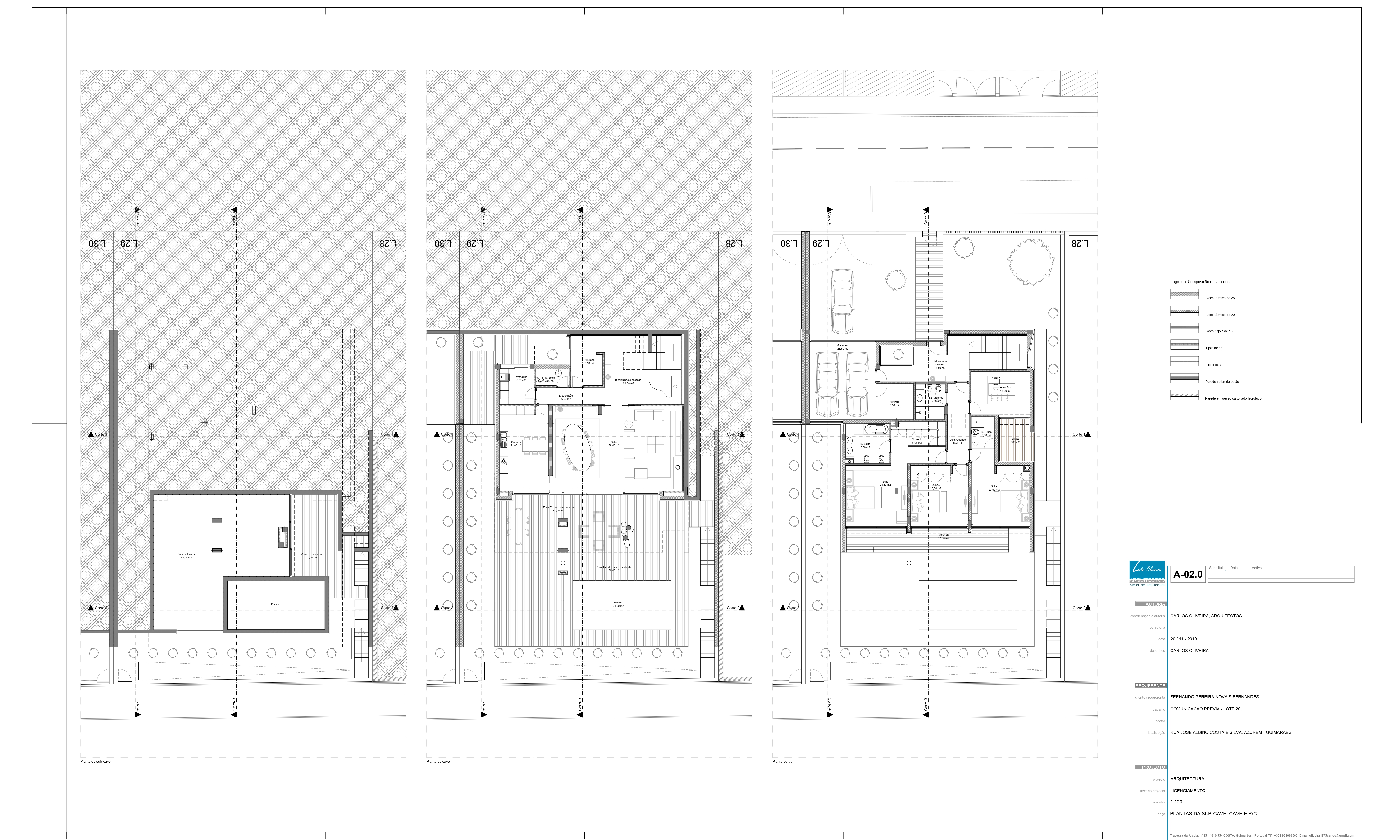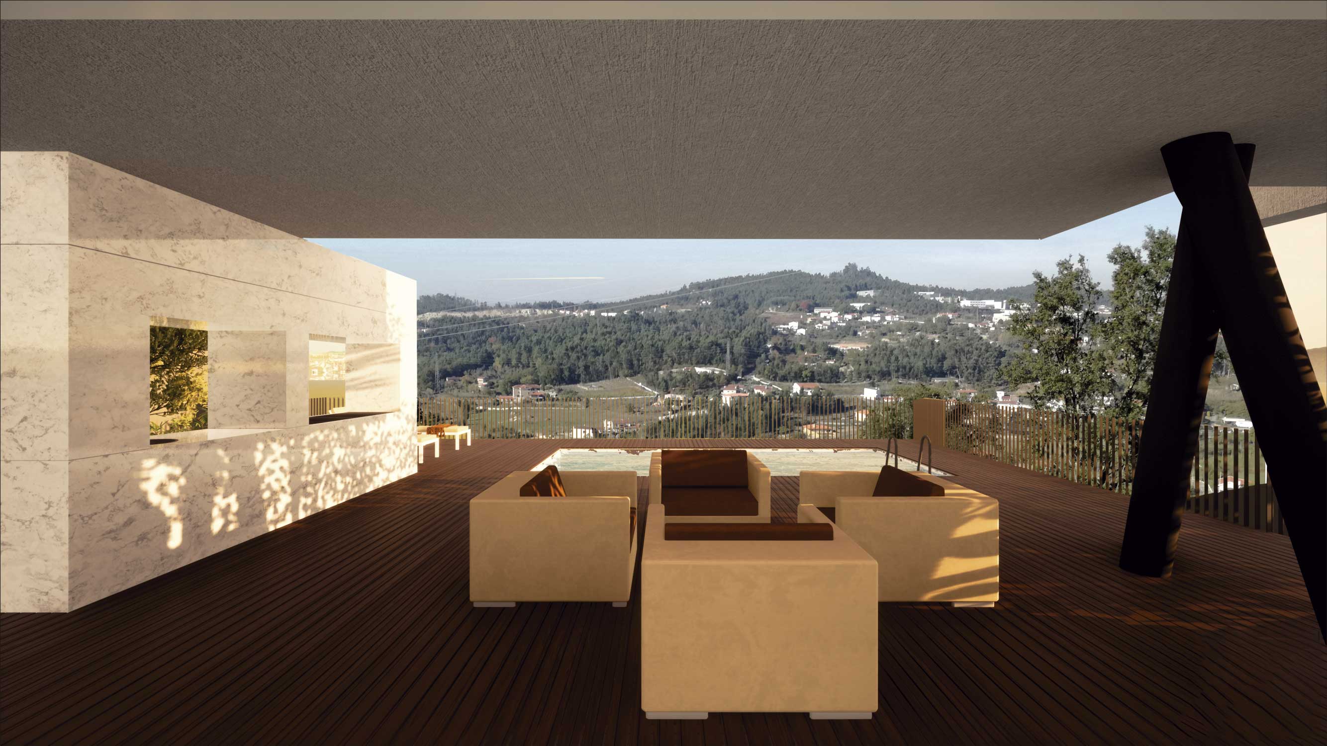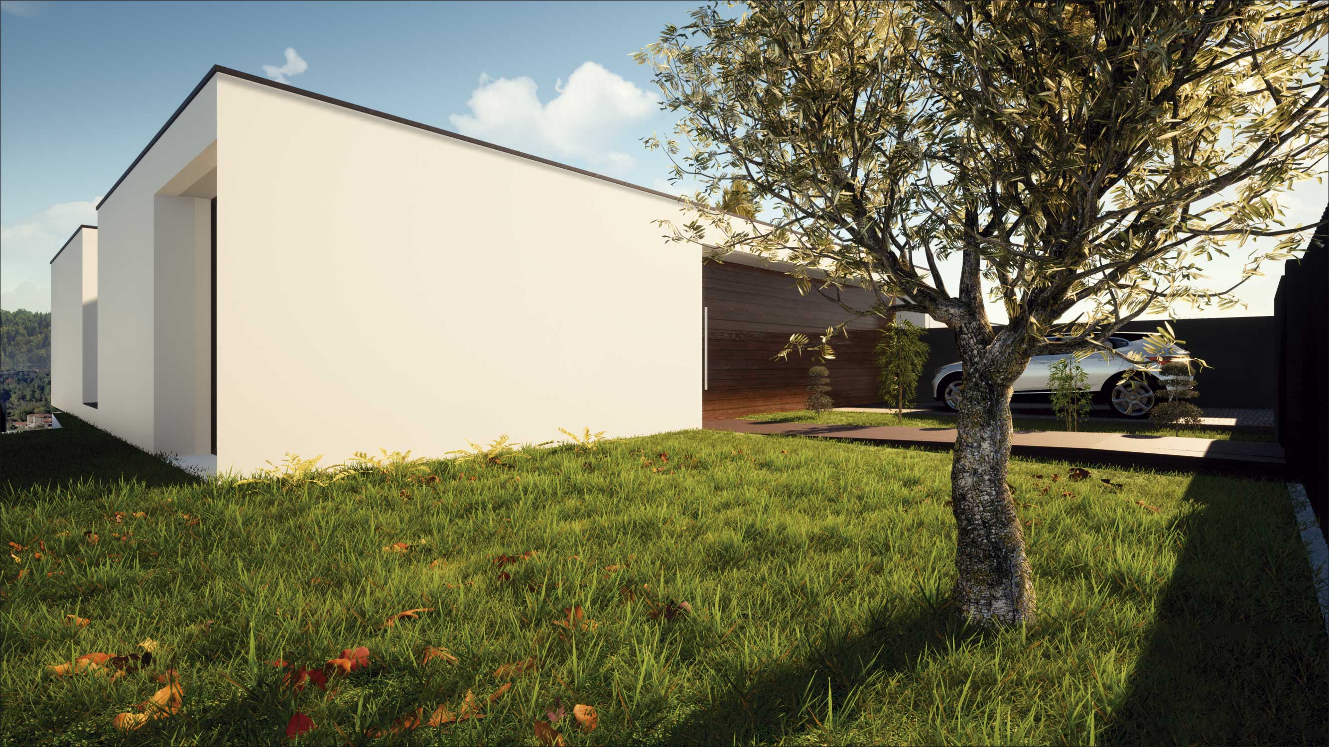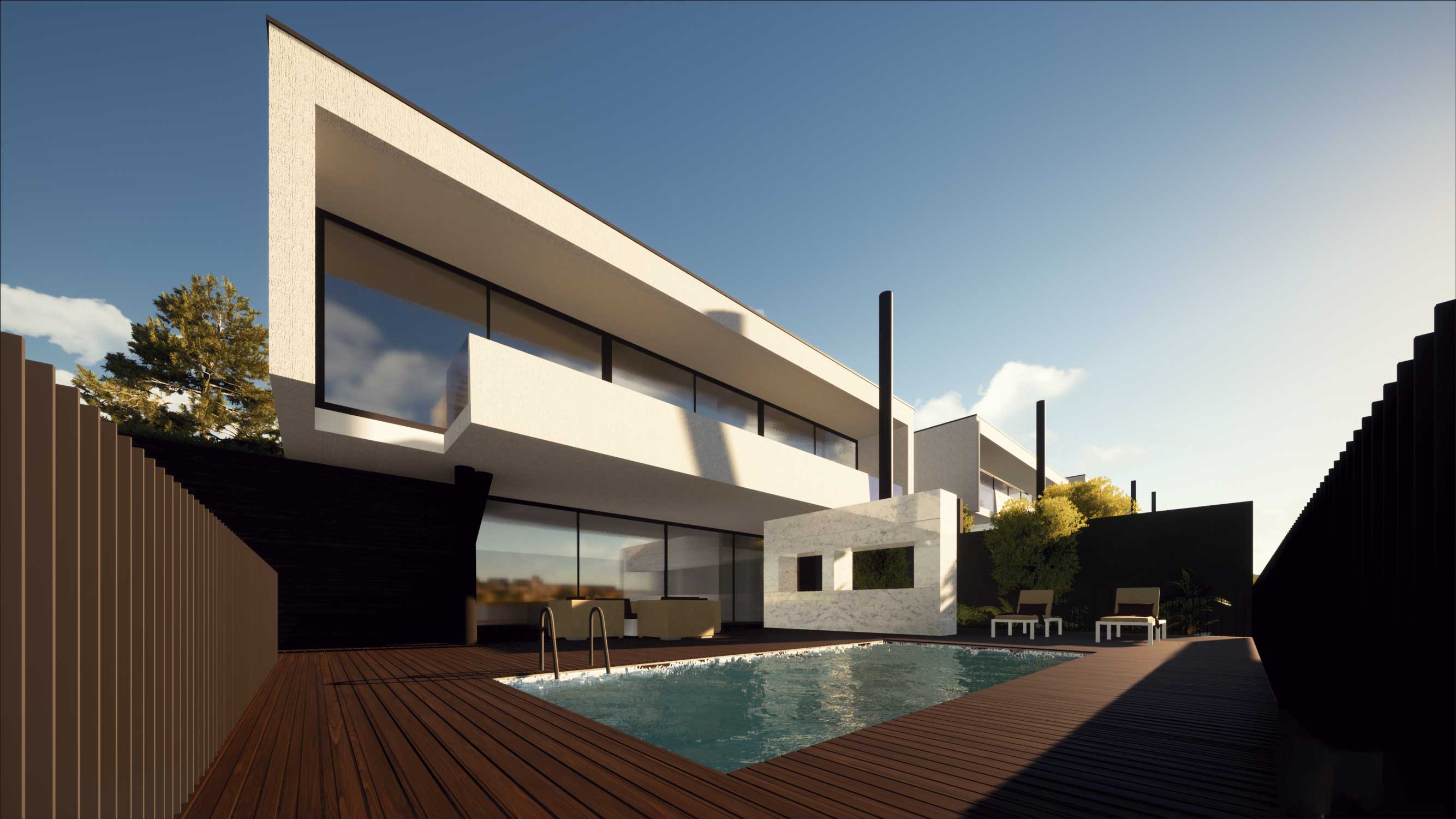 O Loteamento é constituído por quatro moradias de tipologia T3+1 e piscina, constituídas por dois níveis, sendo estes dedicados a usos distintos, diurno e nocturno. O projecto tem como base um terreno com bastante pendente e como tal, as construções adaptam-se à sua morfologia, o que lhes confere uma certa anonimidade a partir da rua de acesso. Procuramos qualidade nos espaços interiores e exteriores recorrendo a um desenho contemporâneo. Numa atitude de afirmação, formalmente apostamos na sobreposição e deslizamento de volumes geradores cheios e vazios, recorrendo a varandas e zonas cobertas, sempre privilegiando o contacto com o exterior, vistas sobre o vale e coando a luz natural.