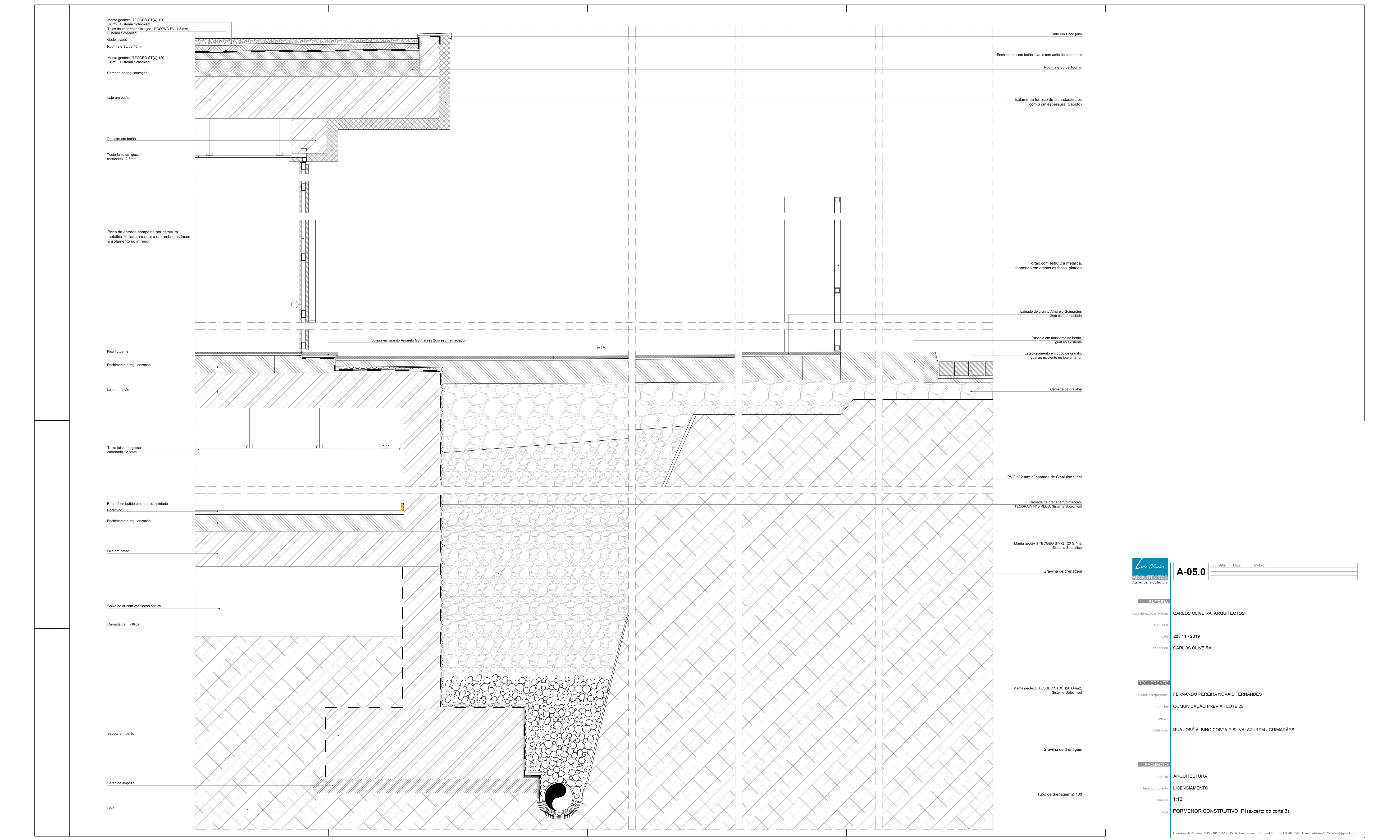 Propomos um edifício que assenta praticamente na cota mais baixa do terreno, ficando o r/c sensivelmente à cota da rua. O programa e a distribuição funcional apresentam-se agrupados por usos e de caráter introvertido. Em busca da melhor solução, bem como de introversão e privacidade, a moradia fecha-se praticamente a Sul, Nascente e Poente, abrindo-se doseadamente para Norte. Pretendesse uma integração na paisagem o mais anónima possível, pelo que se optou por construir um único piso acima da cota da rua de acesso, implantado sensivelmente à cota desta. Esta opção e face à topografia do terreno obriga a que o edifício fique semi-enterrado nos pisos inferiores.
