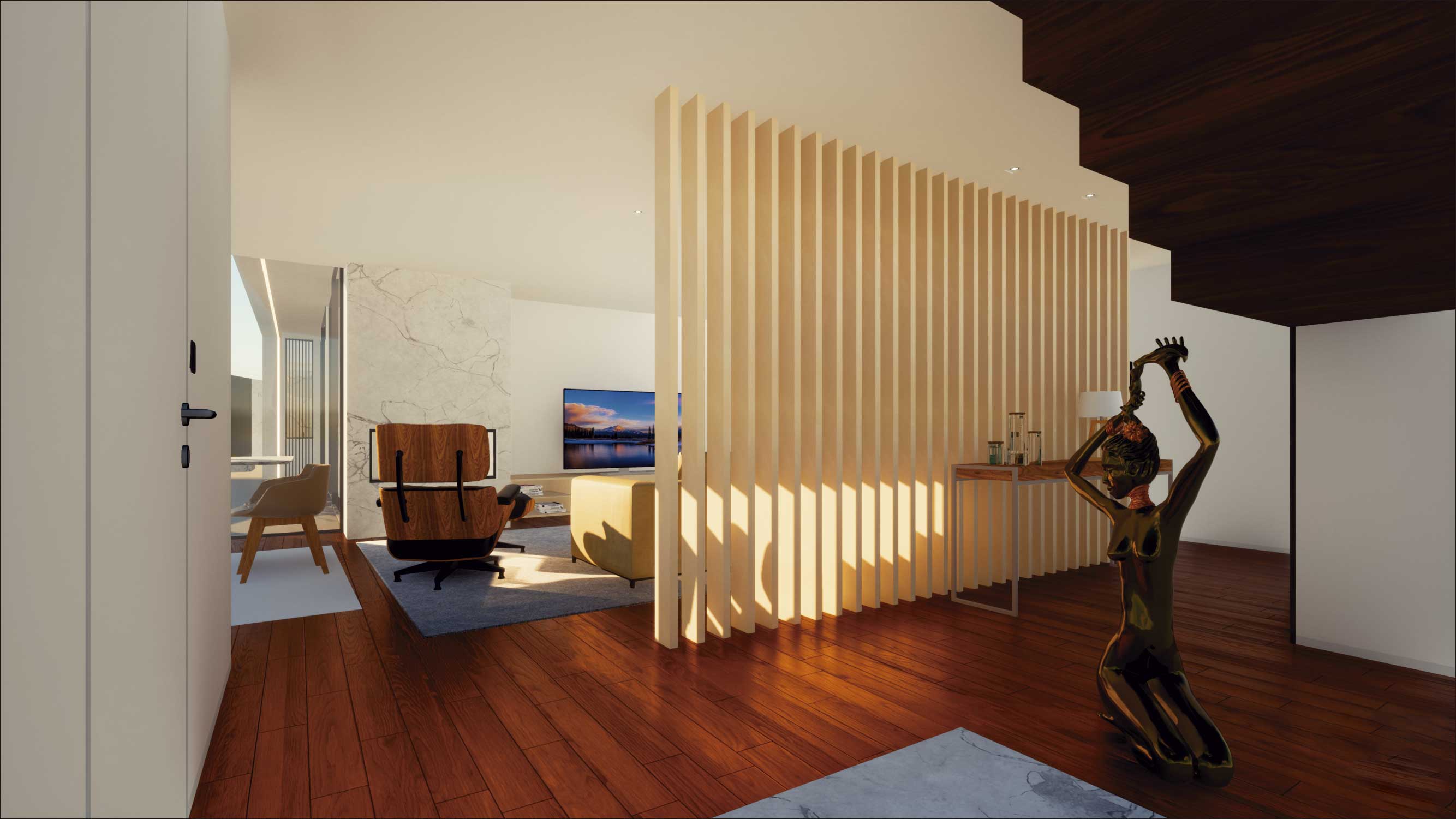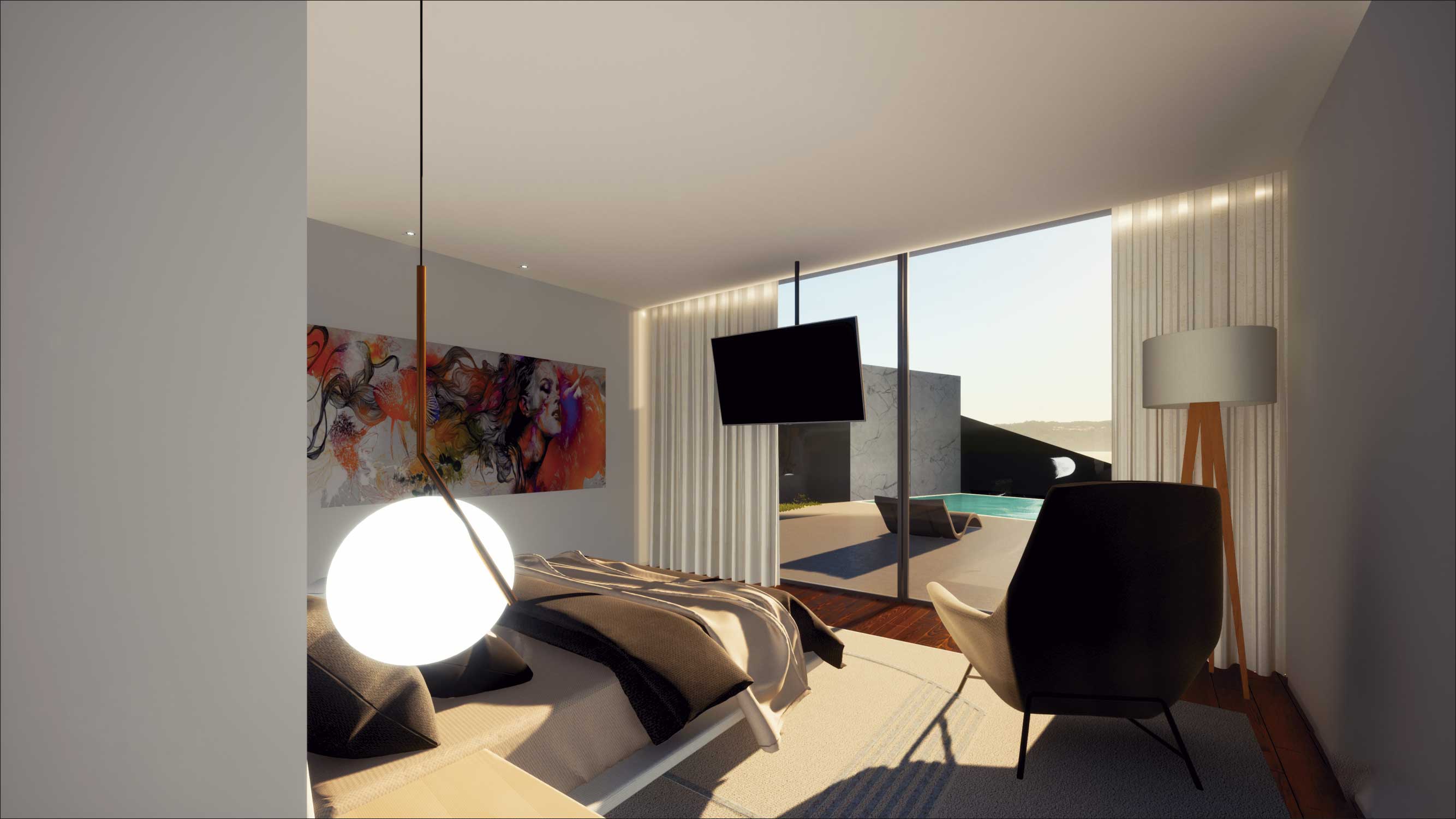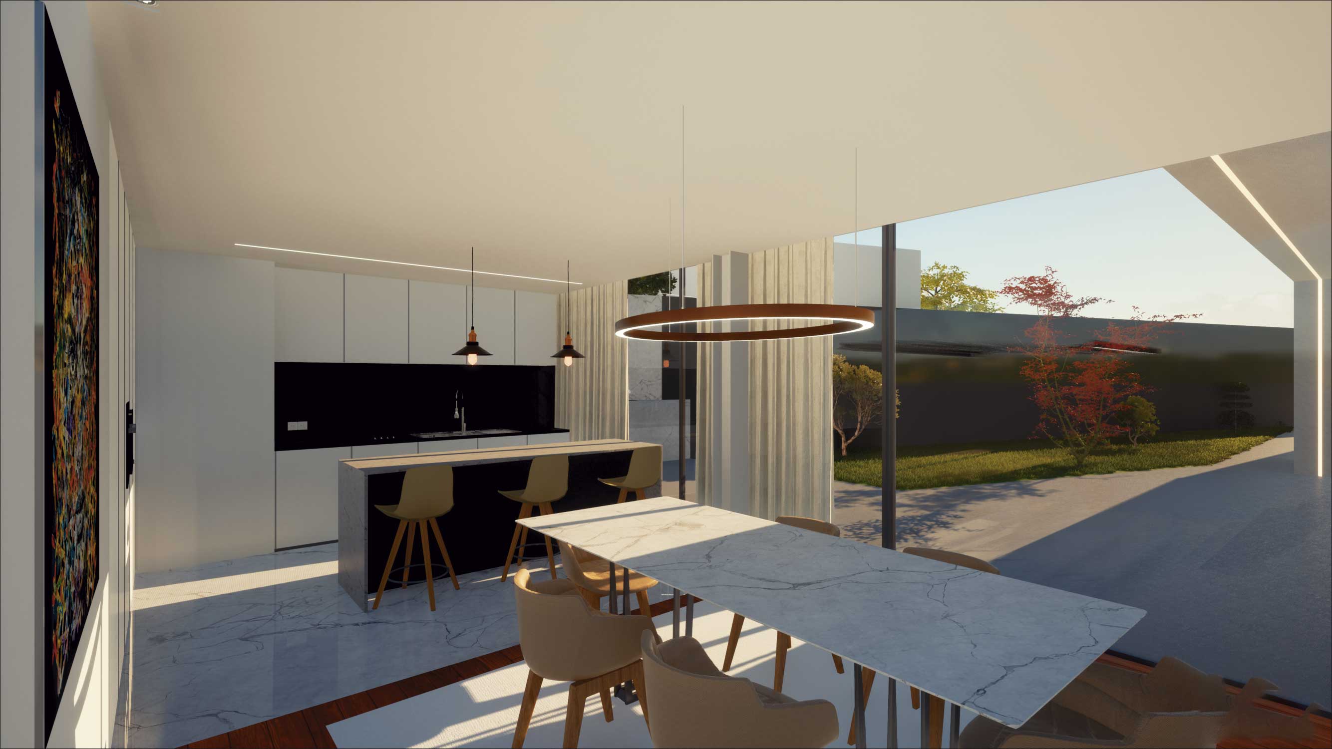 O funcionamento é bastante intuitivo e versátil, apresenta uma distribuição por usos, os compartimentos são agrupados tendo em conta o seu uso, a relação com o exterior no que respeita aos compartimentos de descanso e lazer é bastante valorizada, abrindo-se de forma premeditada, convidando as pessoas a sair e aproveitar a continuidade do espaço como complemento do interior, sempre com a devida privacidade. O piso 0 permite ser acedido a partir da rua fazendo o percurso pedonal que liga à entrada principal e/ou a partir da garagem, convergindo as duas possibilidades para o hall de entrada/distribuição. A partir desta é estabelecido uma ligação às escadas de acesso ao piso inferior. A cave poderá ser acedida pelo exterior percorrendo a envolvente e pelo interior por meio de escadas. Estas chegam a uma distribuição que estabelece a ligação com as dependências de lazer e serviços, com um pequeno escritório e com as dependências reservadas ao descanso. Propomos também a construção de uma piscina ao nível do piso inferior e um anexo implantado numa cota mais baixa.