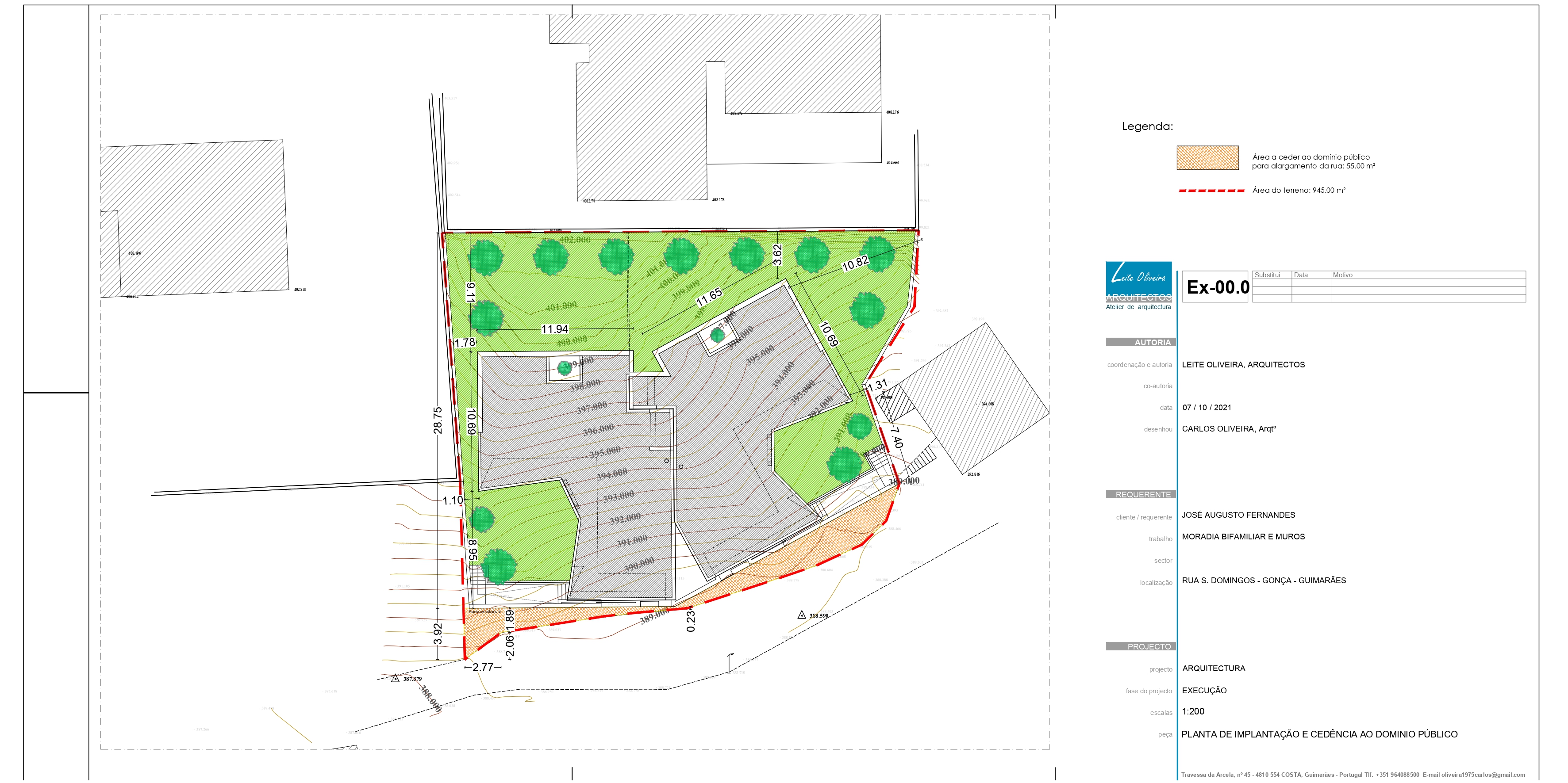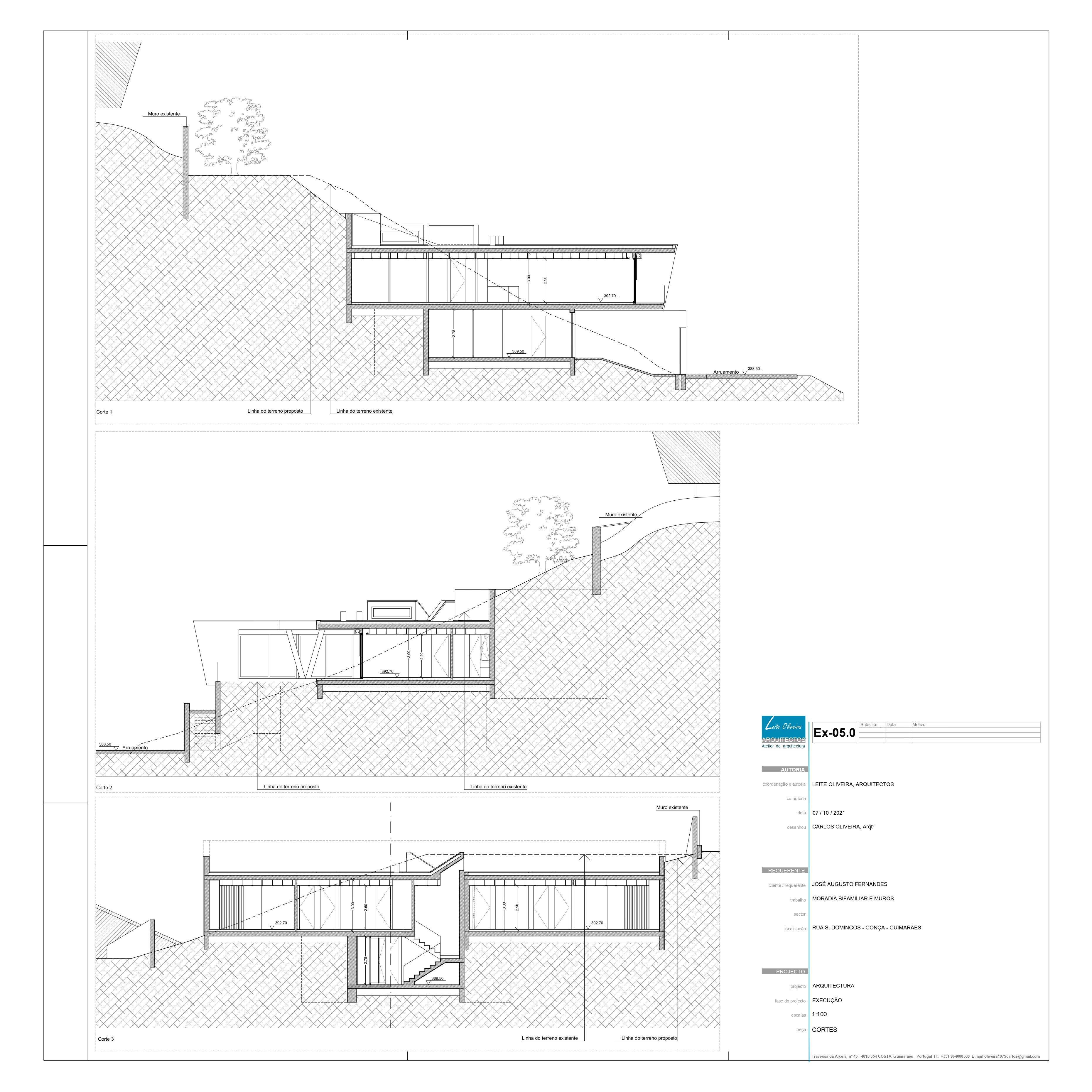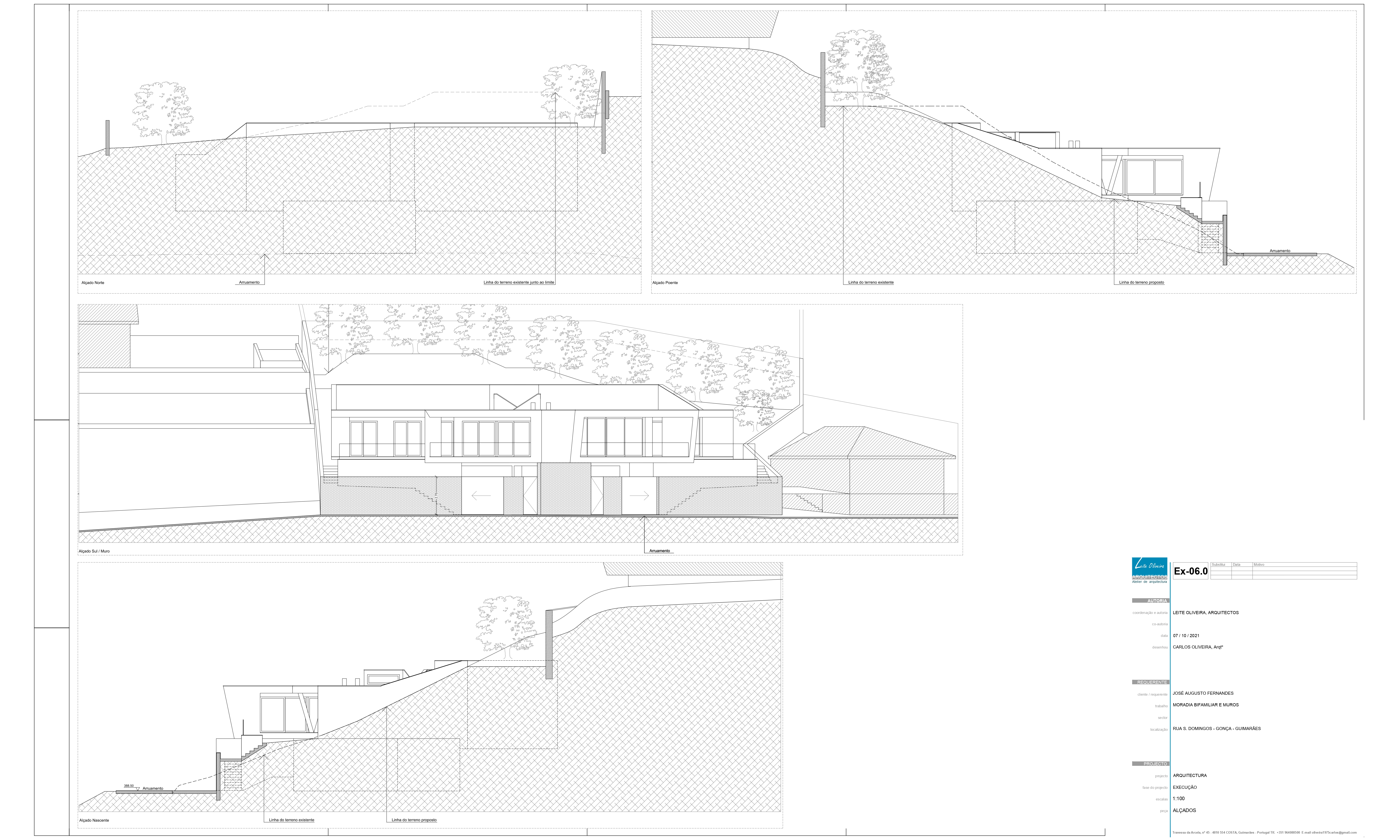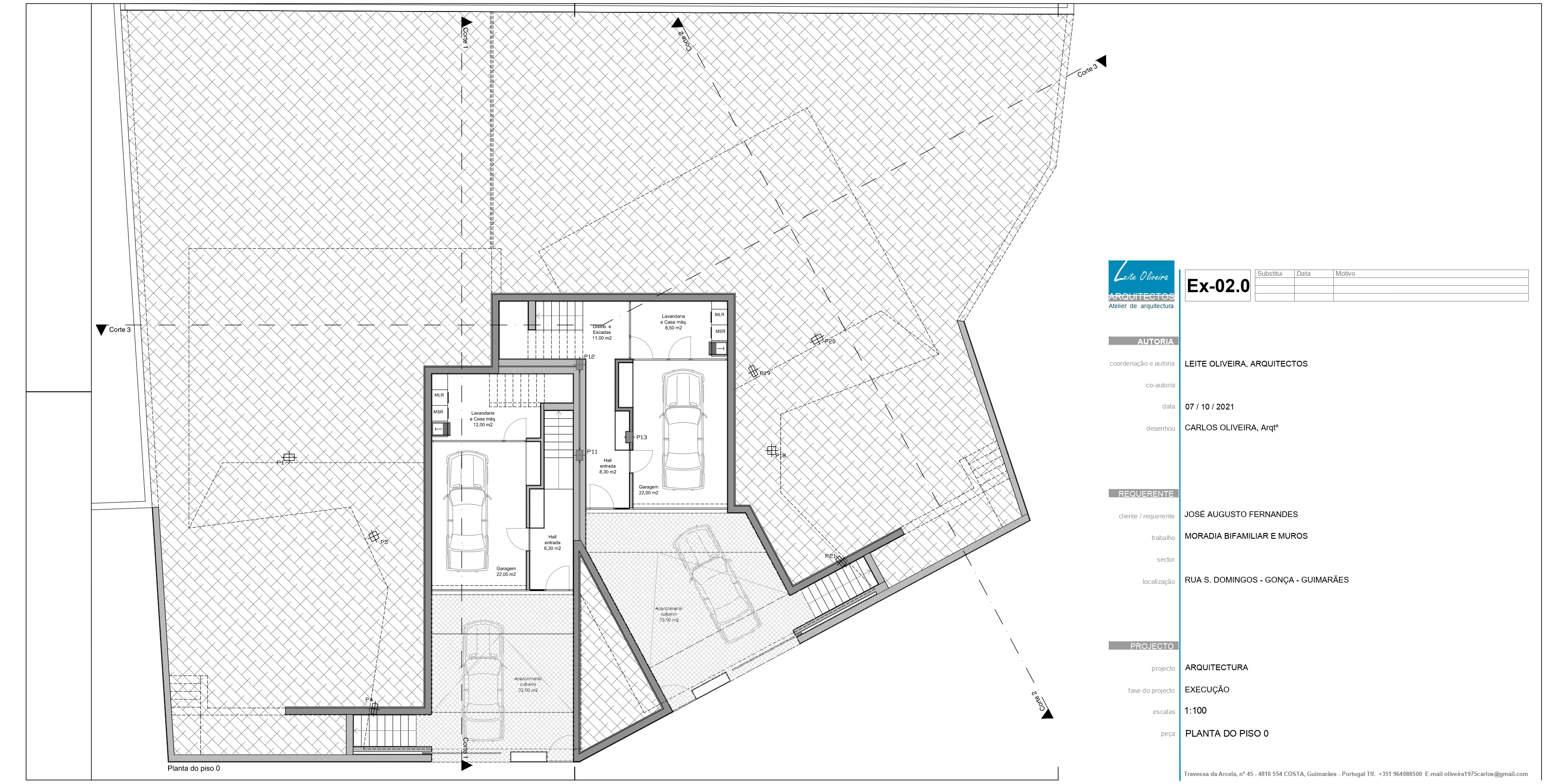 O projecto visa a construção de uma moradia bifamiliar composta por duas habitações tipo T3. Tendo em conta a morfologia bastante acidentada do terreno e no sentido de evitar uma grande movimentação de terras, propomos a implantação do edifício junto da rua e diminuir ao volume de construção no piso inferior. Propomos também construir um muro de suporte na continuidade dos muretes das platibandas, com mais expressão a Norte de modo a adaptar-se à morfologia do terreno. Este muro permite “encaixar a construção no terreno e criar uma plataforma ao nível do piso superior. Partindo das premissas anteriormente descritas e das pretensões do requerente, propomos um edifício composto por dois pisos, encaixado no terreno, em que a imagem assenta na sobreposição de volumes que correspondem a ocupações distintas. Face à topografia do terreno e de modo a evitar um desaterro ainda maior, a cave nasce cerca 1,00 m acima da cota da rua e encaixada no terreno nos quadrantes Norte, Nascente e Poente. O piso superior assenta sobre este e também se encaixa parcialmente no terreno nos mesmos quadrantes. O piso superior das habitações fecha-se a Norte, abrindo-se para Sul, Nascente e Poente onde tem uma franca comunicação com o exterior e com a paisagem. Os acessos, automóvel e pedonal de ambas as habitações são feitos a Sul a partir da via habilitante. O funcionamento é bastante intuitivo e versátil, apresenta uma distribuição por usos e uma relação com o espaço exterior bastante valorizada, embora controlada devido à morfologia do terreno.
