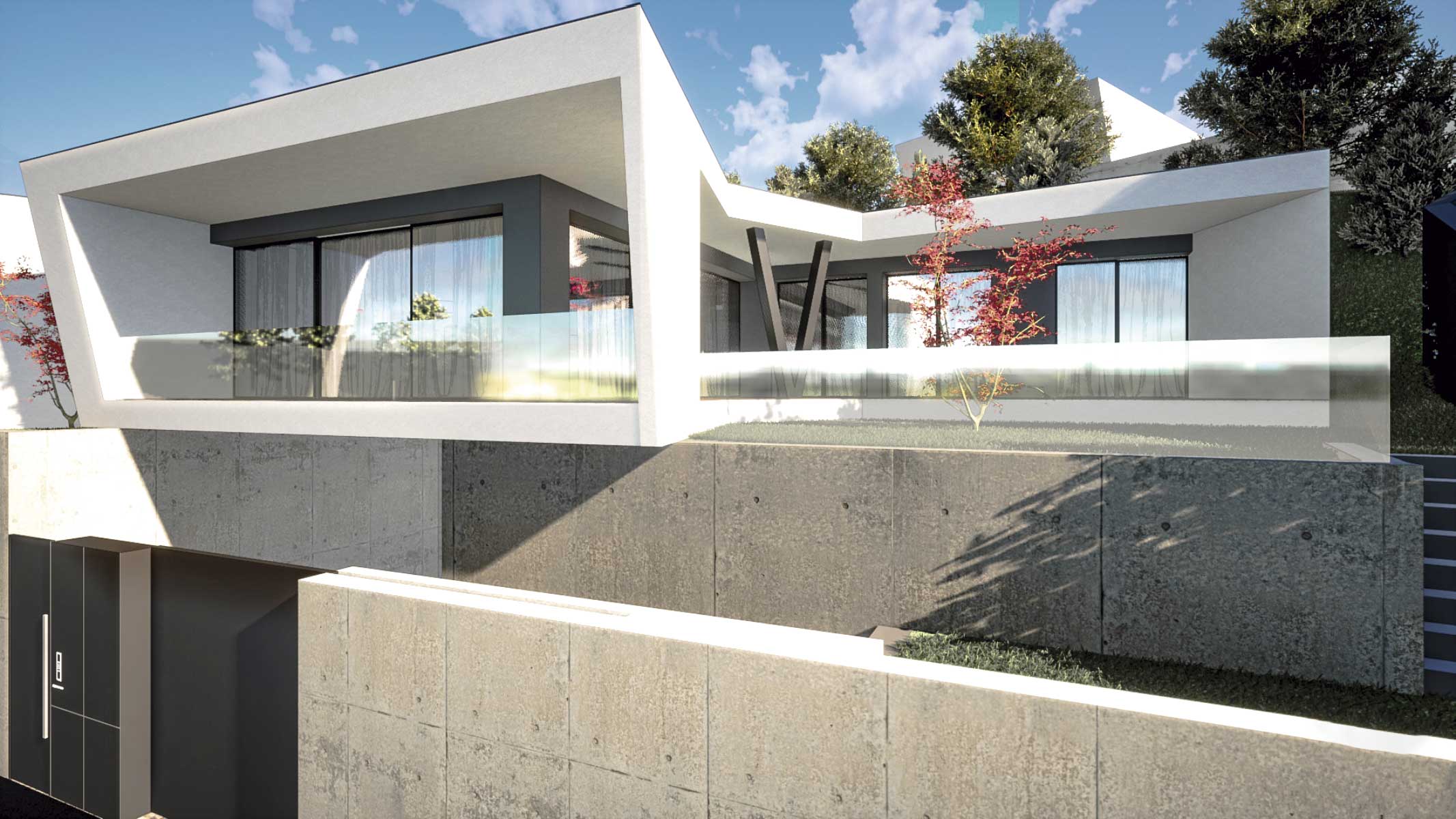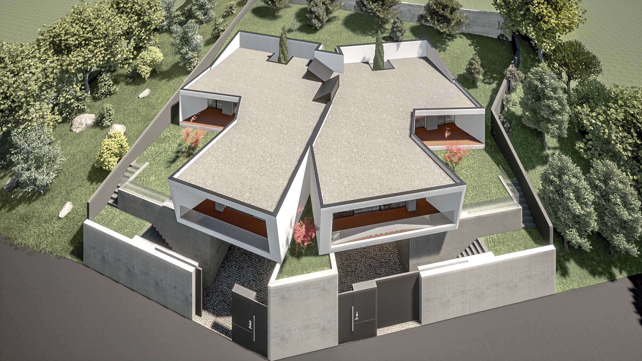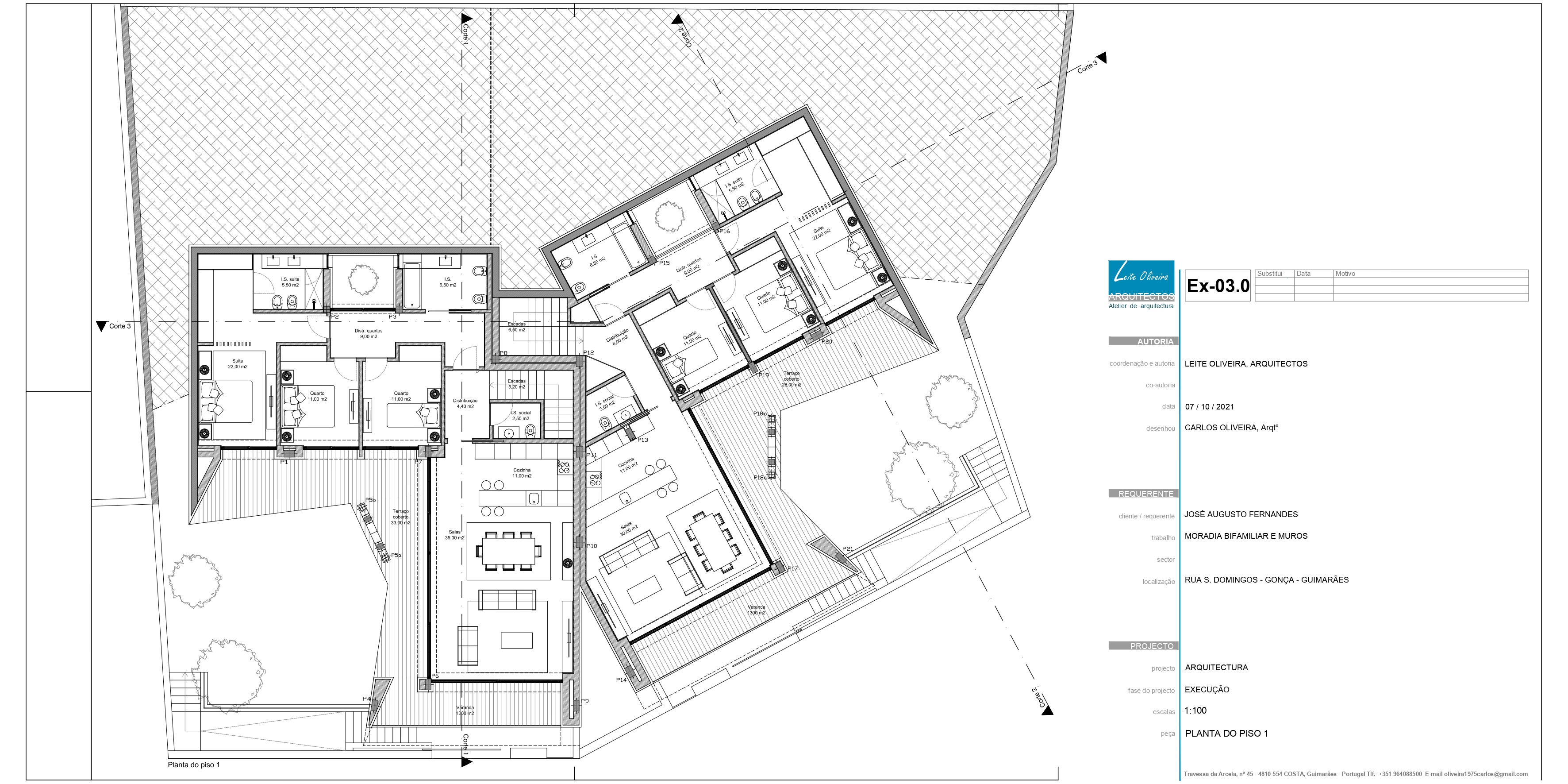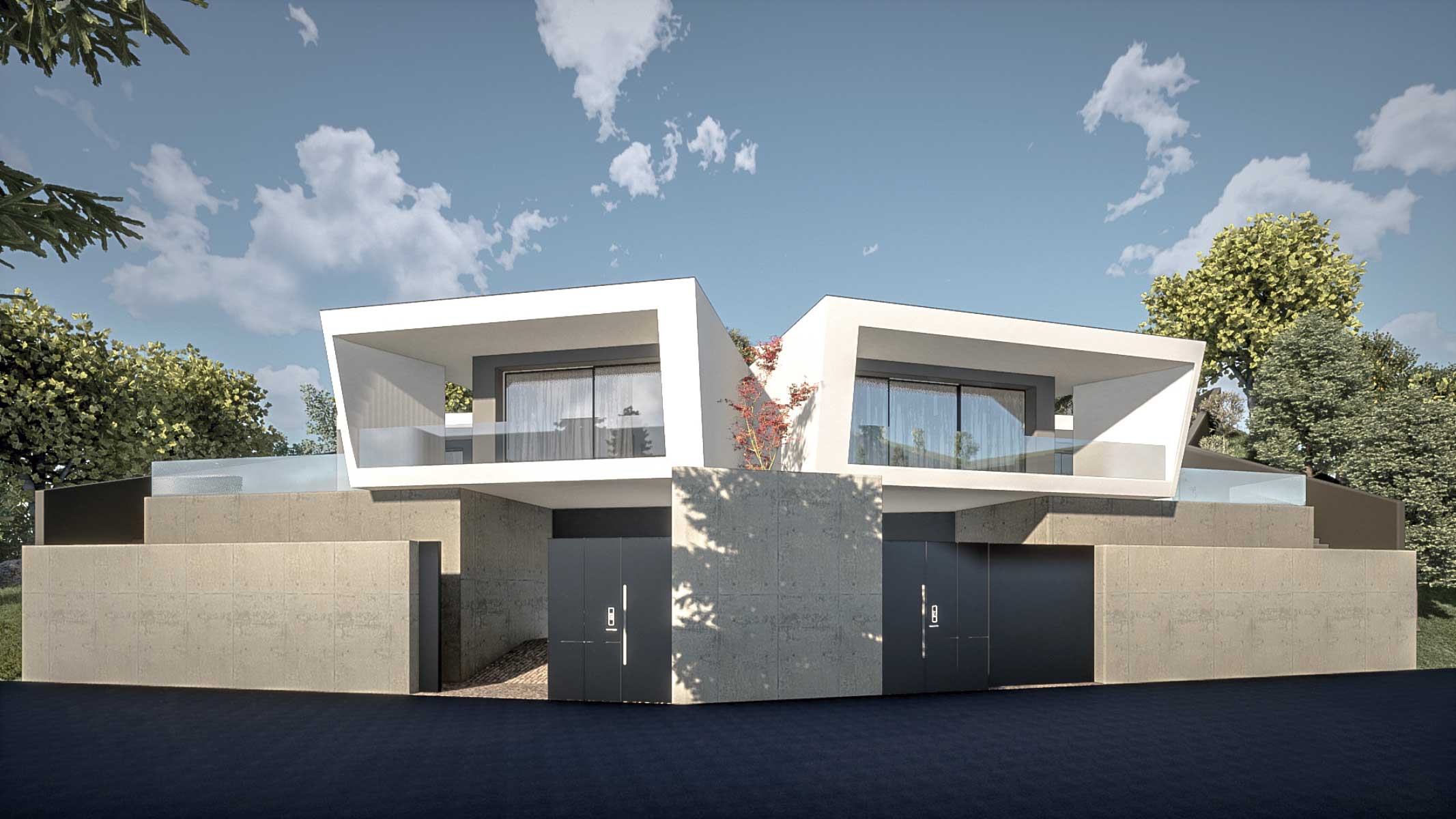 O projecto visa a construção de uma moradia bifamiliar composta por duas habitações tipo T3. Tendo em conta a morfologia bastante acidentada do terreno e no sentido de evitar uma grande movimentação de terras, propomos a implantação do edifício junto da rua e diminuir ao volume de construção no piso inferior. Propomos também construir um muro de suporte na continuidade dos muretes das platibandas, com mais expressão a Norte de modo a adaptar-se à morfologia do terreno. Este muro permite “encaixar a construção no terreno e criar uma plataforma ao nível do piso superior. Partindo das premissas anteriormente descritas e das pretensões do requerente, propomos um edifício composto por dois pisos, encaixado no terreno, em que a imagem assenta na sobreposição de volumes que correspondem a ocupações distintas. Face à topografia do terreno e de modo a evitar um desaterro ainda maior, a cave nasce cerca 1,00 m acima da cota da rua e encaixada no terreno nos quadrantes Norte, Nascente e Poente. O piso superior assenta sobre este e também se encaixa parcialmente no terreno nos mesmos quadrantes. O piso superior das habitações fecha-se a Norte, abrindo-se para Sul, Nascente e Poente onde tem uma franca comunicação com o exterior e com a paisagem. Os acessos, automóvel e pedonal de ambas as habitações são feitos a Sul a partir da via habilitante. O funcionamento é bastante intuitivo e versátil, apresenta uma distribuição por usos e uma relação com o espaço exterior bastante valorizada, embora controlada devido à morfologia do terreno.