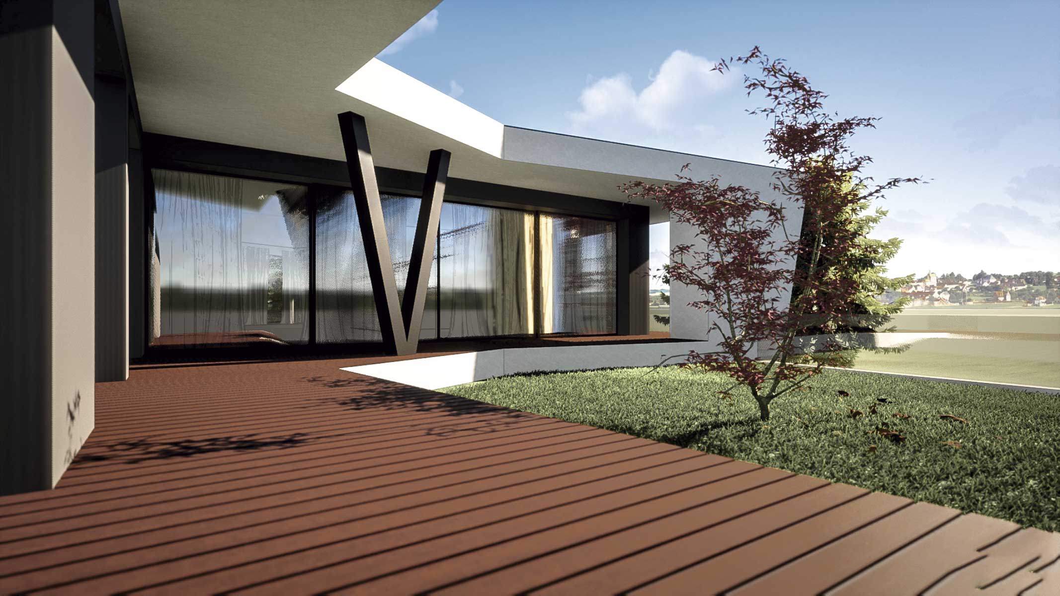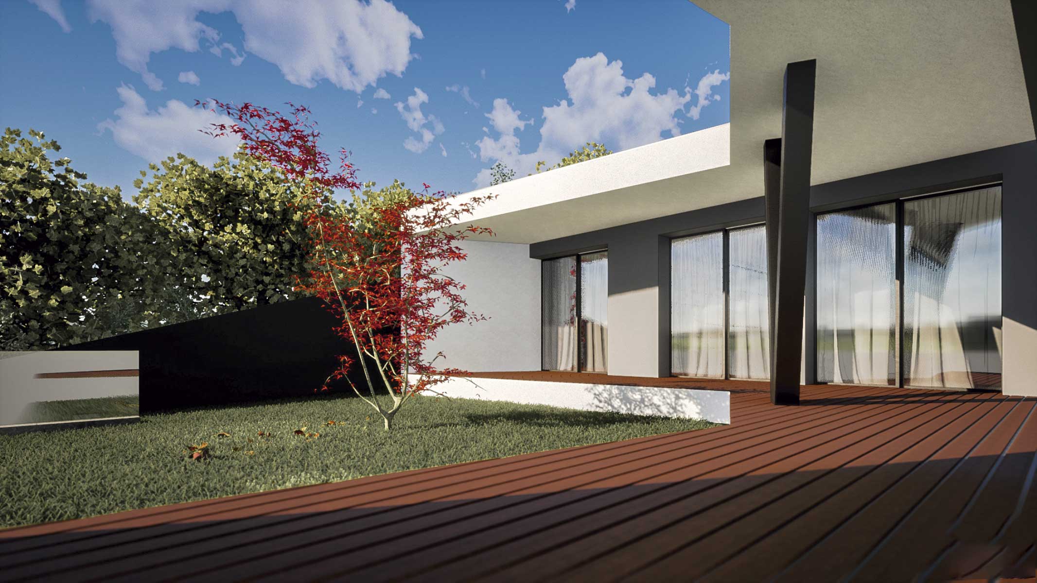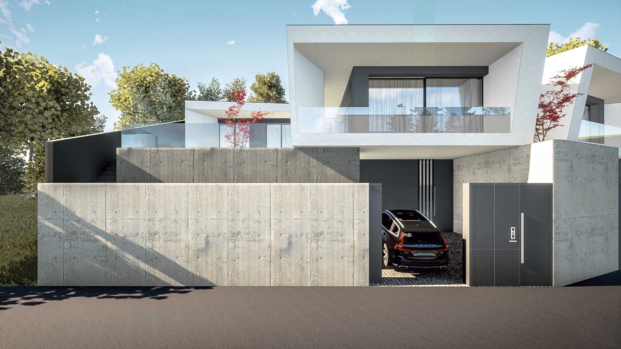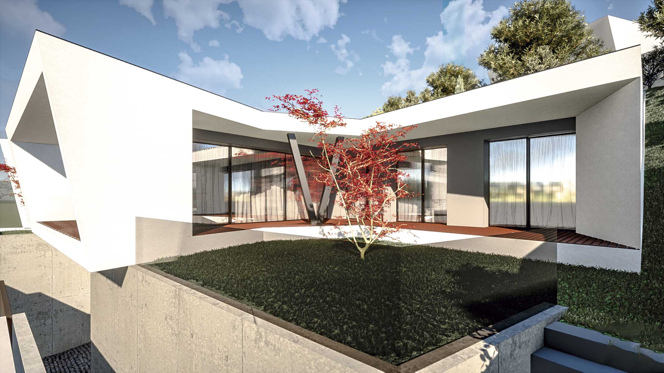 O projecto visa a construção de uma moradia bifamiliar composta por duas habitações tipo T3. Tendo em conta a morfologia bastante acidentada do terreno e no sentido de evitar uma grande movimentação de terras, propomos a implantação do edifício junto da rua e diminuir ao volume de construção no piso inferior. Propomos também construir um muro de suporte na continuidade dos muretes das platibandas, com mais expressão a Norte de modo a adaptar-se à morfologia do terreno. Este muro permite “encaixar a construção no terreno e criar uma plataforma ao nível do piso superior. Partindo das premissas anteriormente descritas e das pretensões do requerente, propomos um edifício composto por dois pisos, encaixado no terreno, em que a imagem assenta na sobreposição de volumes que correspondem a ocupações distintas. Face à topografia do terreno e de modo a evitar um desaterro ainda maior, a cave nasce cerca 1,00 m acima da cota da rua e encaixada no terreno nos quadrantes Norte, Nascente e Poente. O piso superior assenta sobre este e também se encaixa parcialmente no terreno nos mesmos quadrantes. O piso superior das habitações fecha-se a Norte, abrindo-se para Sul, Nascente e Poente onde tem uma franca comunicação com o exterior e com a paisagem. Os acessos, automóvel e pedonal de ambas as habitações são feitos a Sul a partir da via habilitante. O funcionamento é bastante intuitivo e versátil, apresenta uma distribuição por usos e uma relação com o espaço exterior bastante valorizada, embora controlada devido à morfologia do terreno.