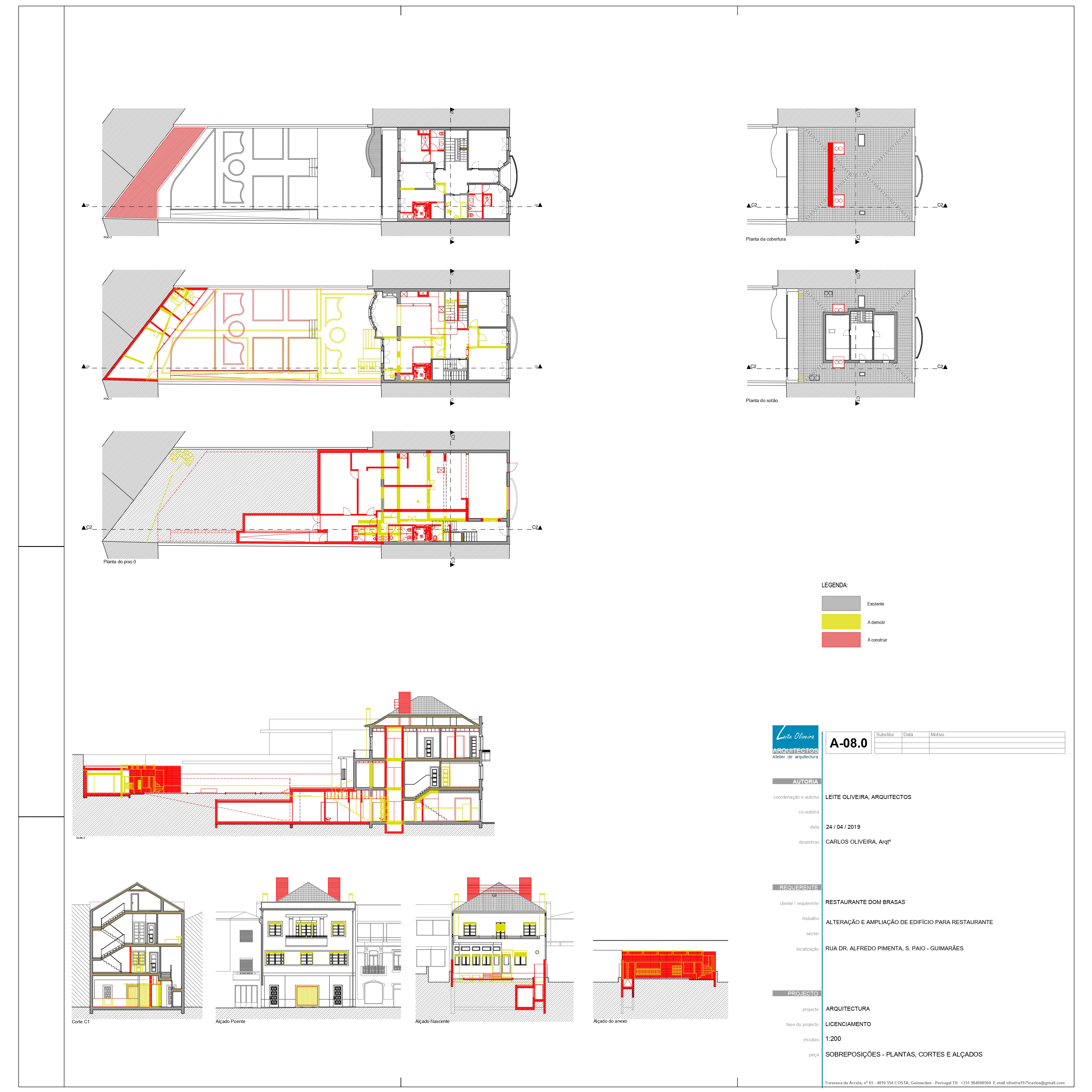 O projecto visa a conversão de um edifício destinado a habitação composto pelo r/c mais dois pisos e águas furtadas em restaurante. Propomos tirar partido da cota do logradouro que fica sensivelmente abaixo de cota de soleira do piso 1 para fazer um desaterro de modo a “encaixar” a ampliação da cave. Pretendemos que a intervenção, à excepção da cave, seja pontual e o mais discreta possível. Propomos manter o maior número de paredes e elementos marcantes do existente, sem descaracterizar o edifício, de modo a que mais tarde possível uma reconversão para habitação.